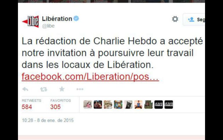 Internacional | El diario Liberation ya había prestado sus instalaciones al semanario en el 2011 'Charlie Hebdo' producirá su semanario en instalaciones del 'Liberation' El diario Liberation ya había prestado sus instalaciones al semanario en el 2011 Por: EL INFORMADOR 8 de enero de 2015 - 14:21 hs El diario Liberation ya había prestado sus instalaciones al semanario en el 2011. TWITTER / @libe GUADALAJARA, JALISCO (08/ENE/2015).- El semanario satírico "Charlie Hebdo" aceptó la invitación del diario "Liberation" para mudar a sus periodistas e ilustradores a esta sede para continuar con su labor periodística. Esto se dio a conocer a través de las cuentas de redes sociales del "Liberation" quien dijo que ya una vez habían pasado por una situación similar y sus colaboradores habían utilizado sus instalaciones, esto en el 2011. El "Liberation" asegura que cuentan con todas las herramientas para que el personal del "Charlie Hebdo" puedan sacar adelante su próximo número la semana que entra en donde hasta el momento se desconoce el contenido que puedan publicar. Ante esto, usuarios han aplaudido la solidaridad de los medios de comunicación franceses y por su lucha ante la libertad de expresión en comentarios que se han hecho debajo de esta publicación en Facebook. En cuanto a los responsables del acto terrorista, se sabe que se sospecha que se encuentran acorralados por la policía en un edificio de la localidad de Crépy-en-Valois, al noreste de París y aunque esto no ha sido confirmado medios locales los señalan por el despliegue policíal que hay en la zona en estos momentos. EL INFORMADOR / CAROLINA QUINTANILLA Temas Francia Facebook Twitter Agresiones a periodistas Redes Sociales Lee También Esta es la verdadera identidad del "Juan Gabriel" captado en París "Streamer" transmite su parto en vivo y causa revuelo en redes sociales Así puedes comenzar tu ahorro en el Banco del Bienestar CURP biométrica: ¿Será necesario tramitarla para los programas del Bienestar? Recibe las últimas noticias en tu e-mail Todo lo que necesitas saber para comenzar tu día Registrarse implica aceptar los Términos y Condiciones