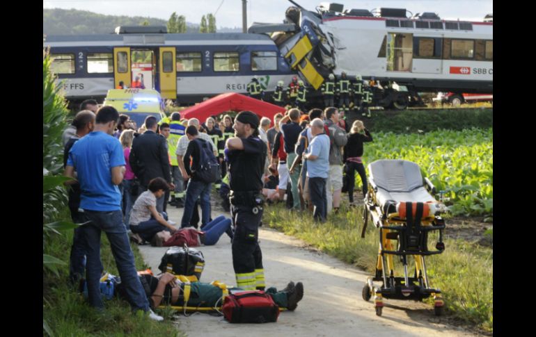 Internacional | La colisión frontal se produjo en las cercanías de Granges-près-Marnand Choque de trenes deja 44 heridos en el oeste de Suiza La colisión frontal se produjo en las cercanías de Granges-près-Marnand, a unos 50 kilómetros al suroeste de la capital Por: EL INFORMADOR 29 de julio de 2013 - 14:38 hs BRUSELAS, BÉLGICA (29/JUL/2013).- Al menos 44 heridos, cuatro de ellos de gravedad, dejó el choque entre dos trenes registrado en Granges-près- Marnard, canton de Vaud, en el oeste de Suiza, informó la policía local la noche de este lunes. La colisión frontal se produjo en las cercanías de Granges-près-Marnand, a unos 50 kilómetros al suroeste de la capital, Berna, y en ella se vieron involucrados un tren que se aproximaba a la estación ferroviaria y otro que salía de ella rumbo Lausanne. Por el momento se desconocen las causas del accidente, mientras la línea férrea fue cortada inmediatamente después del percance, indicaron fuentes de los Ferrocarriles Federales de Suiza (SBB). El accidente ocurrió cerca de la estación de Granges-près-Marnand poco antes de las 19: 00 horas locales (17:00 GMT) en una línea regional. Al sitio han acudido bomberos, ambulancias, helicópteros y policías. Según la Policía, al menos una persona sigue debajo de los escombros. "Cuando nuestro tren llegaba a la estación, otro impactó frontalmente", señaló uno de los pasajeros al diario Le Tribune de Genève. Los conductores de ambos convoyes han sido evacuados del lugar en estado grave. A principios de este mes, 79 personas murieron en un descarrilamiento de alta velocidad en el noroeste de España. Temas Europa Suiza Accidentes ferroviarios Lee También Cierran dos tramos de avenida Juárez por caída de un poste y de ramas Bebé sobreviviente a explosión de Iztapalapa comenzará rehabilitación Helicóptero se desploma en autopista de Sacramento, esto se sabe del accidente Derrumbe de edificio en Madrid deja cuatro desaparecidos y tres heridos Recibe las últimas noticias en tu e-mail Todo lo que necesitas saber para comenzar tu día Registrarse implica aceptar los Términos y Condiciones