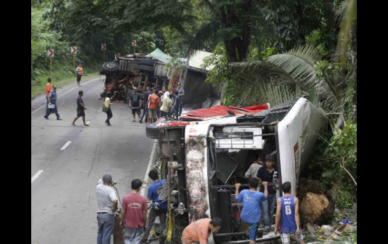 Internacional | Cuatro camiones colisionan en una carretera estrecha a causa de la lluvia Choque múltiple en Filipinas mata al menos a 19 personas Cuatro camiones colisionan en una carretera estrecha a causa de la lluvia Por: EFE 19 de octubre de 2013 - 06:36 hs La mayoría de los pasajeros trabajaban en el ayuntamiento de Capalonga. AP / MANILA, FILIPINAS (19/OCT/2013).- Al menos 19 personas han muerto hoy en el norte de Filipinas y varias decenas han resultado heridas tras una colisión múltiple en la que se vieron involucrados tres autocares y cuatro camiones, informaron medios locales. El accidente ocurrió de madrugada en la localidad de Atimonan, en la provincia de Quezon, unos 115 kilómetros al norte de Manila, cuando un autocar perdió el control en una bajada de una carretera estrecha y mojada por la lluvia. El superintendente de la policía provincial, Ronaldo Genaro Ylagan, indicó al portal "Inquirer" que el autocar chocó sucesivamente contra dos camiones, dos autocares, un tercer camión y una furgoneta. A causa del accidente también han resultado heridas al menos 44 personas, que han sido trasladas a varios hospitales de la zona. El jefe de la Policía de Atimonan, Jomar Yupio, dijo que la mayoría de muertos viajaban en el autocar que causó el siniestro y en el que iban unas 49 personas. Según la emisora dzBB, la mayoría de estos pasajeros eran trabajadores del ayuntamiento de Capalonga que regresaban a su casa tras participar en un seminario de formación. Cientos de personas mueren cada año en Filipinas por accidentes de este tipo debido al mal estado de las carreteras y los vehículos, la conducción temeraria y la laxitud de las autoridades de tráfico. Temas Asia Accidentes en el mundo Filipinas Lee También Pakistán y Afganistán acuerdan un cese al fuego Jugadores de LaLiga se manifiestan contra el partido en Miami Protestan contra Trump en Estados Unidos Accidente de autobús en Brasil deja 15 muertos Recibe las últimas noticias en tu e-mail Todo lo que necesitas saber para comenzar tu día Registrarse implica aceptar los Términos y Condiciones