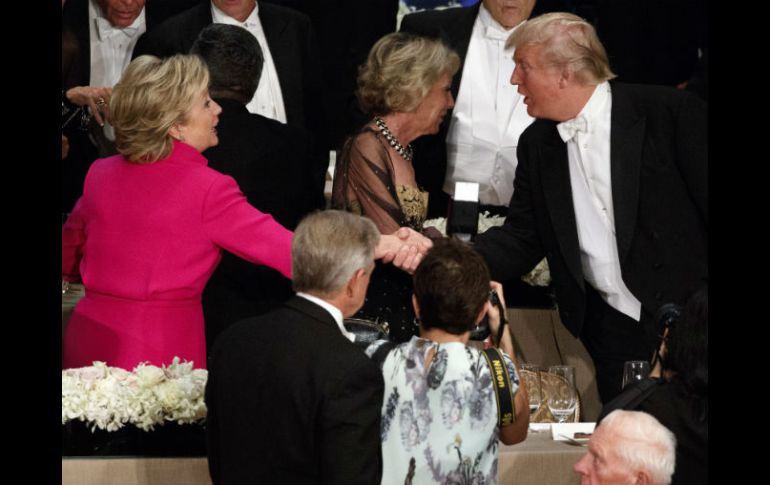 NUEVA YORK, ESTADOS UNIDOS (20/OCT/2016).- Hillary Clinton y Donald Trump intercambiaron hoy bromas salpicadas con comentarios ácidos en una cena de caridad celebrada un día después del último debate presidencial previo a las elecciones de EU del 8 de noviembre.La cena, que se celebró en el hotel Waldorf Astoria, cumple con una tradición de décadas para invitar a candidatos presidenciales a una cena de gala que les permita reflejar su sentido de humor, pero en esta ocasión coincidió con la etapa final de una áspera campaña electoral por los choques entre Clinton y Trump.En uno de los momentos, el republicano Trump echó en cara a Clinton que era la primera vez que hablaba con personalidades tan importantes "sin que le paguen por ello".Y la demócrata ensalzó la caballerosidad del republicano por mandarle un vehículo para que la trasladara a la cena de esta noche, pero dijo que se trataba de un "coche fúnebre".Los discursos de ambos candidatos presidenciales, el de Clinton más largo que el de Trump, aludieron a distintas situaciones que se han desarrollado durante la campaña y hasta los comentarios más recientes hechos en el debate presidencial del miércoles.Todo ello ante una audiencia de un millar de personas, de rigurosa etiqueta para la cena de gala, en la que Clinton y Trump se sentaron muy cerca, separados sólo por el arzobispo de Nueva York, el cardenal Timothy Michael Dolan.En una sola ocasión, cuando terminó su discurso Clinton, ambos candidatos presidenciales se saludaron dándose la mano, pero en el acto se notó la frialdad que deriva de la áspera relación que han tenido en los últimos meses.Entre las bromas que hizo Trump figura el supuesto ofrecimiento de Clinton para que, si llega a la Casa Blanca, el magnate neoyorquino se convierta en embajador de Estados Unidos en Irak o Afganistán, aludiendo a los peligros a los que estaría expuesto en esos países.También lamentó que su esposa Melania haya recibido críticas por haber pronunciado "el mismo discurso" que la primera dama, Michelle Obama, mientras que esta última solo recibió elogios.Esa parte aludía a revelaciones de que partes de un discurso que pronunció Melania Trump fueron tomadas de otro previo de Michelle Obama.Clinton reconoció que no era conocida por su sentido del humor, aunque sostuvo que siempre ha destacado por el buen ánimo demostrado en las fiestas a las que ha acudido, a pesar de que reconoció que solo habían ido a tres.Y aludiendo a las críticas de que no dice lo mismo en sus discursos privados a inversionistas que en los mítines electorales, Clinton dijo que esta noche iba a decir una única verdad: "Esta elección pasará pronto".Al margen de las bromas, Trump llegó a calificar a Clinton de "corrupta", tanto que "la echaron de la Comisión del Watergate", lo que generó abucheos de parte del público,Clinton echó en cara a Trump que cuando la gente reconoce en la Estatua de la Libertad un símbolo que ilumina a los inmigrantes, el magnate republicano solo ve un "cuatro", aludiendo a comentarios machistas de Trump valorando el físico de las mujeres entre uno y diez.Y, en caso de que la estatua se desprendiera de la antorcha y la tableta, "y se arreglara el pelo", quizás llegaría a cinco puntos, agregó la aspirante demócrata, quien encabeza las encuestas para la votación del 8 de noviembre.La candidata demócrata dio pie a pensar que su discurso iba a ser mucho más áspero de lo que resultó cuando aseguró que en el lugar coincidía "dos mortales enemigos" y con una fuerte rivalidad política. Pero a continuación aclaró que se estaba refiriendo al gobernador de Nueva York y al alcalde de la ciudad, Andrew Cuomo y Bill de Blasio, respectivamente, ambos demócratas y que han destacado por numerosas diferencias políticas.Entre las bromas que citó Trump dijo que antes de llegar a la cena había chocado con Clinton en los pasillos y ella le pidió que le disculpara, utilizando el término en inglés "Pardon me", que también puede aludir a un indulto presidencial."Lo veré cuando llegue a la Casa Blanca", agregó Trump, que en días recientes amenazó con "meter en la cárcel" a Clinton por las irregularidades derivadas del uso de un servidor de internet privado para sus correos electrónicos cuando era secretaria de Estado.La cena de gana suele servir para que los candidatos se rían de sí mismos, y Trump, por ejemplo, afirmó que su mejor cualidad era su modestia, casi "mejor" que su temperamento.La aspirante demócrata, por su parte, dijo que acudía a la cena rompiendo "su riguroso programa de siestas", aludiendo a las constantes críticas de Trump de que en lugar de volcarse en la campaña estaba descansando.Pero aseguró que, de llegar a la Casa Blanca, será la mujer "más joven y con mejor salud" que haya alcanzado ese puesto. Hillary Clinton, de ganar en los comicios, se convertirá en la primera mujer que ocupa la Presidencia de Estados Unidos.