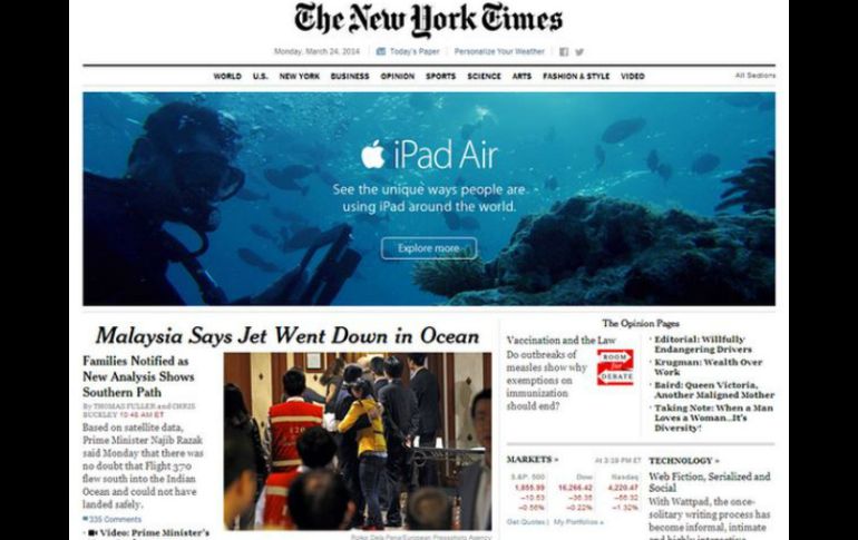 Internacional | La crítica se debe a la publicidad que portaba al dar la noticia del Malaysia Airlines Critican 'desafortunada' publicidad del NYT La crítica se debe a la publicidad que portaba al momento de dar la noticia del Malaysia Airlines Por: EL INFORMADOR 24 de marzo de 2014 - 17:41 hs El portal tenía un anuncio del iPad Air, donde se muestra a un buzo debajo del mar. ESPECIAL / GUADALAJARA, JALISCO (24/MAR/2014).- El prestigioso periódico digital The New York Times ha sido fuertemente criticado por usuarios de las redes sociales por la publicidad que portaba al momento de dar la noticia del Malaysia Airlines. El portal tenía un anuncio del iPad Air, donde se muestra a un buzo bajo del mar, al momento de dar la noticia de que el avión desaparecido de la mencionada aerolínea había caído al Océano Índico. Las críticas no se hicieron esperar y usuarios en Twitter lo marcaron como un 'infortunado error', comentando por ejemplo '@Guerraeterna El mensaje está claro. Si tu avión cae al mar, será mejor que lleves un iPad. Y un equipo de buceo.' Otros comentarios: @javisalas Olé @nytimes por esa publi tan oportuna @MarkaFreak El #FAIL en el home de @nytimes @mmeida Tremendo fail publicitario del @nytimes @old_eyre El anuncio adecuado en el momento justo @ccentenoc Definitivamente, el @nytimes no ha elegido la mejor publicidad para ilustrar su portada... Temas Norte América Desapariciones y caídas de aviones Accidentes aéreos Malasia New York Times Twitter Lee También José Jerí asume como presidente de Perú Congreso de Perú destituye como presidenta a Dina Boluarte Gobierno federal refuerza combate a extorsión y desapariciones NFL: Sorpresiva derrota de los Eagles ante Giants Recibe las últimas noticias en tu e-mail Todo lo que necesitas saber para comenzar tu día Registrarse implica aceptar los Términos y Condiciones