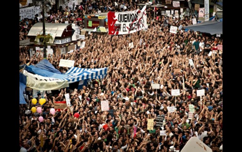 Internacional | La mayoría de las protestas continúa de forma pacífica Desalojan a algunos manifestantes previo a comicios en España La policía desalojó a los manifestantes que se habían instalado en las plazas de Jacinto Benavente, Carretas y Tirso de Molina, próximas a la plaza principal de la Puerta del Sol Por: NTX 21 de mayo de 2011 - 16:58 hs - La protesta española moviliza a decenas de jóvenes portugueses- Miles de personas mantienen en España sus protestas en jornada de reflexión MADRID, ESPAÑA (21/MAY/2011).- La policía de España disolvió el sábado algunas concentraciones en Madrid, en momentos en que multitudes protestaban en diversas partes contra lo que describen como la ineficacia de los políticos frente al alto desempleo y la desaceleración económica del país. Sin embargo, la mayoría de las protestas (algunas emprendidas desde el lunes), continuó de manera pacífica, y los organizadores descartaron que fueran un desafío a la autoridad porque sus actos no eran proselitistas, de cara a las elecciones regionales y municipales del domingo. En España están prohibidas las movilizaciones y actos de propaganda durante la llamada "jornada de reflexión" que antecede a los comicios. El Movimiento 15-M, que encabeza las protestas, afirmó que las movilizaciones concluirán cuando los ciudadanos lo decidan. La policía desalojó a los manifestantes que se habían instalado en las plazas de Jacinto Benavente, Carretas y Tirso de Molina, próximas a la plaza principal de la Puerta del Sol, en Madrid, según despachos de la agencia noticiosa Europa Press. Los inconformes que exhibían carteles y gritaban lemas a coro censuraron lo que describieron como abusos e ineptitud de los políticos con las medidas adoptadas frente a los problemas financieros en el país. España tiene una tasa de desempleo de 21.3%, la más alta entre los 17 países de la Unión Europea que utilizan al euro como moneda. "Manos arriba, esto es un atraco", "el pueblo unido jamás será vencido" y "lo que llaman democracia y no lo es" eran algunos de los lemas de los manifestantes, de acuerdo con Europa Press. Los inconformes reunidos en la Puerta del Sol observaron a las 21:00 horas un minuto de silencio, en señal ”dijeron” de respeto por la jornada de reflexión. Las calles de acceso a la plaza estaban atestadas de manifestantes que participaban en diversos mítines. Las movilizaciones se han propagado a distintas localidades de España y son similares a las ocurridas en Grecia, Portugal e Irlanda, las naciones de la Unión Europea más afectadas por la recesión reciente. El sábado, los españoles no sólo protestaron en su país. En Perú decenas se concentraron frente a la embajada de España en Lima con carteles que decían "el poder nos teme porque la revuelta enamora" y "no hay pan para tanto chorizo". "La población española ya no puede soportar más y se echó a la calles. Estamos desde Lima los españoles que vivimos aquí apoyando las revueltas a todos los compañeros españoles", dijo Juan Espósito, un español residente en Lima. Espósito dijo que "se han hecho manifestaciones en las embajadas de España y se está contagiando la revuelta social en otros países debido a los recortes sociales generados por la crisis del gobierno español". Temas Europa España Manifestaciones en el mundo Lee También Sociales: El Informador inicia una nueva etapa con la moderna imprenta "Doña Stella" España consigue su boleto a los cuartos de final del Mundial Sub-20 Derrumbe de edificio en Madrid deja cuatro desaparecidos y tres heridos Lo peor es que Claudia también tiene sus dudas Recibe las últimas noticias en tu e-mail Todo lo que necesitas saber para comenzar tu día Registrarse implica aceptar los Términos y Condiciones