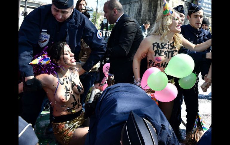 Internacional | Las feministas trataron de boicotear un acto político del Frente Nacional Detienen a activistas de Femen, en Francia Las mujeres tenían pintado en su pecho descubierto lemas como 'Viva el fin del FN' y fueron desalojadas en furgones por los agentes Por: EFE 1 de mayo de 2016 - 05:38 hs Las militantes de Femen acudieron con pañuelos en la cabeza y escobas, así como botellas de champán. AFP / A. Jocard PARÍS, FRANCIA (01/MAY/2016).- La Policía francesa detuvo hoy a activistas de la organización feminista radical Femen que intentaron boicotear el "banquete popular y patriota" que la presidenta del Frente Nacional (FN), Marine Le Pen, ha organizado a puerta cerrada para sus militantes con motivo del 1 de Mayo. El grupo llegó poco después de las 12:00 hora local (10:00 GMT) a la parisina Puerta de la Villette con botellas de champán, pelucas de colores y cotillón para celebrar el fin de ese partido ultraderechista. Las activistas tenían pintado en su pecho descubierto lemas como "Viva el fin del FN" y fueron desalojadas en furgones por los agentes al poco de su llegada. También hoy en París, ese mismo movimiento saludó que Le Pen no haya ofrecido este año su habitual discurso en la plaza de la Ópera. "El 1 de mayo de 2016 marca un momento histórico en Francia: el partido fascista y xenófobo Frente Nacional no organiza su tradicional marcha en las calles de París. Estamos orgullosas de limpiar nuestras calles democráticas y laicas de su sucio odio", señaló la organización en su página de Facebook. Las militantes de Femen acudieron a esa céntrica plaza de la capital con pañuelos en la cabeza, fregonas y escobas, y escenificaron simbólicamente esa "limpieza antifascista". Le Pen, que mantuvo el homenaje a la patriótica figura francesa de Juana de Arco, renunció este año al desfile para, según los medios, alejarse de este tipo de incidentes, que el año pasado también estuvieron protagonizados por militantes Femen. Reflejo de la distancia entre Marine y su padre, el fundador del partido, Jean-Marie Le Pen, fue el acto paralelo que este último organizó hoy, y en el que vaticinó la derrota de su sucesora en las elecciones de 2017 si esta última no hace nada para corregir la división interna. Temas Europa Francia Manifestaciones en el mundo Feminismo Recibe las últimas noticias en tu e-mail Todo lo que necesitas saber para comenzar tu día Registrarse implica aceptar los Términos y Condiciones