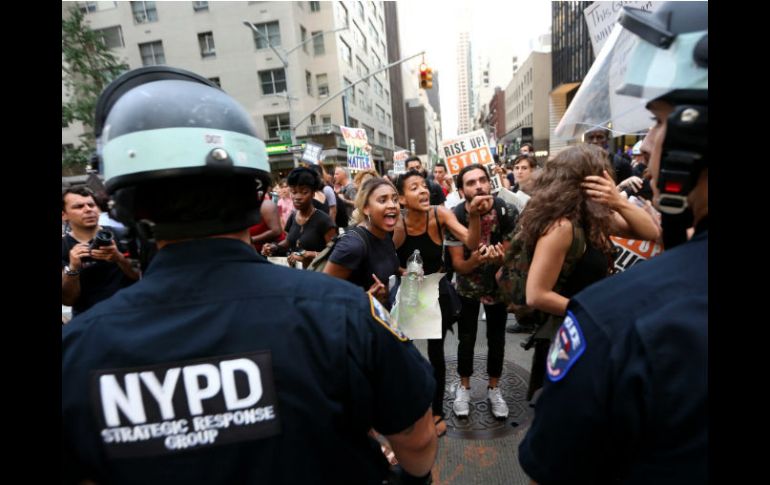 Internacional | Los arrestos fueron realizados por conductas desordenadas dentro de la manifestación Detienen en NY a 40 protestantes contra brutalidad policial Los arrestos fueron realizados por conductas desordenadas dentro de la manifestación Por: NTX 8 de julio de 2016 - 09:41 hs Elementos de la policia de Nueva York vigilando el orden durante la manifestación contra la brutalidad Policial. EFE / ARCHIVO NUEVA YORK, ESTADOS UNIDOS (08/JUL/2016).- Autoridades de Nueva York informaron este viernes el arresto de más de 40 personas en la manifestación contra la brutalidad policial en Estados Unidos, organizada la noche del jueves luego de que fuerzas del orden mataron a dos afroamericanos en la semana. Voceros de la policía confirmaron a medios locales de información que una de las personas que participó en la manifestación, que reunió a cerca de un millar de neoyorquinos, fue arrestada por golpear a un uniformado. Pese a la agresión, ninguna persona resultó lastimada, y el resto de los arrestos fueron realizados por conductas desordenadas de los manifestantes, de acuerdo con los voceros de la policía. La manifestación inició luego de las cinco de la tarde del jueves en la céntrica plaza de Union Square, desde donde algunos de los manifestantes comenzaron a caminar, en sentido contrario a la circulación, por la Quinta Avenida de Manhattan. Algunos de quienes participaron en la marcha portaban pancartas con leyendas del movimiento "Las vidas negras importan" y "Alto a la brutalidad policial". Otros coreaban uno de los eslóganes socorridos en estas protestas: "sin justicia, no hay paz". La marcha de Nueva York fue replicada en varias ciudades de Estados Unidos. En la ciudad de Dallas, la protesta fue la ocasión empleada por cuatro francotiradores para matar a cuatro oficiales de la policía y causar heridas a seis uniformados más. Obama, quien había señalado que las muertes de los afroamericanos a manos de la policía a tasas tan elevadas revelaban las "disparidades raciales" en Estados Unidos, condenó los ataques contra los uniformados en Dallas como un acto "cruel, calculado y despreciable". Temas Norte América Tiroteo Estados Unidos Racismo Lee También Sheinbaum descarta riesgo por crecimiento del río Pánuco en Tamaulipas Protestan contra Trump en Estados Unidos ¿Empate entre Cruz Azul y América? Esto pronostica la IA Desfile de Alebrijes Monumentales, ruta y hora del evento HOY en CDMX Recibe las últimas noticias en tu e-mail Todo lo que necesitas saber para comenzar tu día Registrarse implica aceptar los Términos y Condiciones