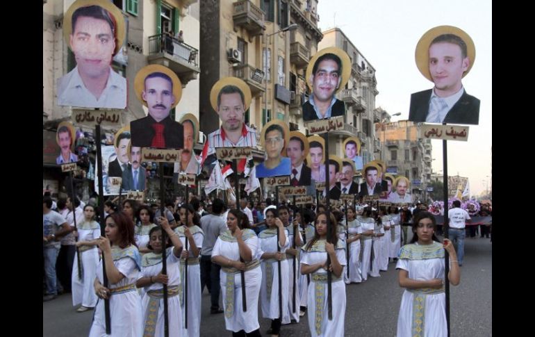 Internacional | La Unión de los jóvenes de Maspero convocó una marcha para el primer aniversario Egipcios se manifiestan para recordar muerte de cristianos La Unión de los jóvenes de Maspero, que congrega a activistas cristianos, había convocado una marcha para el primer aniversario de la matanza de Maspero Por: AFP 9 de octubre de 2012 - 19:32 hs Manifestantes coptos sujetan fotos de las víctimas asesinadas durante los enfrentamientos de Maspero. EFE / EL CAIRO, EGIPTO (09/OCT/2012).- Miles de egipcios se manifestaron este martes con motivo del primer aniversario de los disturbios que causaron 28 muertos durante la represión policial de una manifestación de coptos (cristianos de Egipto). "O se les hace justicia, o morimos como ellos", gritaban los manifestantes, que hicieron el mismo recorrido que las víctimas hace un año. La Unión de los jóvenes de Maspero, que congrega a activistas coptos, había convocado una marcha "para el primer aniversario de la matanza de Maspero". "La única petición política en este día es reclamar justicia para los mártires y que se juzgue a los criminales implicados en esta matanza", afirmó el grupo en Facebook. El 9 de octubre de 2011, miles de coptos se manifestaron en protesta contra el incendio de una iglesia en Asuán (sur) pero la marcha degeneró en enfrentamientos con soldados. Temas África Egipto Manifestaciones en el mundo Lee También Trump viajará a Egipto para la firma entre Israel y Hamás Sociales: El Informador inicia una nueva etapa con la moderna imprenta "Doña Stella" Egipto clasifica al Mundial 2026 con doblete de Mohamed Salah Lo peor es que Claudia también tiene sus dudas Recibe las últimas noticias en tu e-mail Todo lo que necesitas saber para comenzar tu día Registrarse implica aceptar los Términos y Condiciones