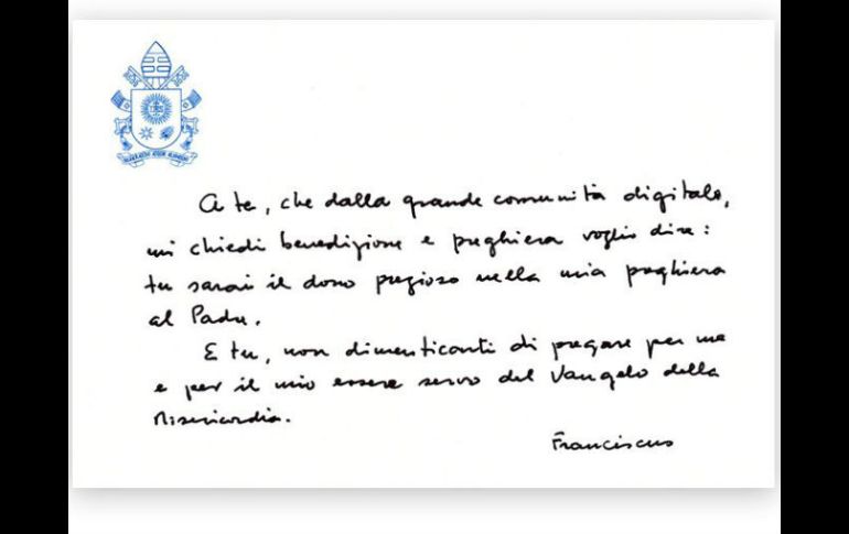 Internacional | Pide a sus seguidores, vía redes sociales, que no se olviden de rezar por él El Papa publica primer mensaje escrito a mano vía Instagram Pide a sus seguidores, vía redes sociales, que no se olviden de rezar por él Por: EFE 8 de mayo de 2016 - 08:25 hs El Pontífice, en su primer mensaje escrito a mano a sus seguidores de Instagram, pide que recen por él. INSTAGRAM / @Franciscus CIUDAD DE VATICANO (08/MAY/2016).- El Papa Francisco envió hoy su primer mensaje escrito de puño y letra a sus seguidores en la red social de Instagram, donde aseguró tenerlos en sus oraciones y les pidió, como suele hacer, que recen por él. Se trata del primer mensaje a mano de Jorge Bergoglio publicado en esta red social desde que el papa abriera su perfil oficial el pasado 19 de marzo con el nombre de @Franciscus. "A ti, que desde la gran comunidad digital me pides bendiciones y oración, quiero decirte 'tú serás el don precioso en mi oración al padre' y no te olvides de rezar por mí para que sea siervo del Evangelio de la Misericordia", afirma el Papa. La fotografía subida a la red social muestra estas palabras escritas en italiano, en bolígrafo negro sobre un folio blanco y con el escudo papal en azul. Debajo de la imagen, sin embargo, el mensaje ha sido traducido al inglés, portugués, español, francés y alemán. Momentos después de que el Papa actualizara su perfil de Instagram, muchos han sido los seguidores que se han apresurado a responder al pontífice con mensajes en diversos idiomas asegurando que rezarán por él. El Papa Francisco abrió su cuenta de Instagram en marzo y desde entonces ha subido 59 publicaciones, entre fotografías y vídeo, y cuenta con 2.3 millones de seguidores. Bergoglio ha defendido en diversas ocasiones la importancia de las redes sociales para difundir el Evangelio a nivel internacional. Está presente en Twitter con el nombre de Pontifex, cuenta que fue creada por voluntad de Benedicto XVI e inaugurada el 12 de diciembre de 2012. Temas Europa Twitter Redes Sociales Instagram Papa Francisco Lee También Esta es la verdadera identidad del "Juan Gabriel" captado en París "Streamer" transmite su parto en vivo y causa revuelo en redes sociales Así puedes comenzar tu ahorro en el Banco del Bienestar CURP biométrica: ¿Será necesario tramitarla para los programas del Bienestar? Recibe las últimas noticias en tu e-mail Todo lo que necesitas saber para comenzar tu día Registrarse implica aceptar los Términos y Condiciones