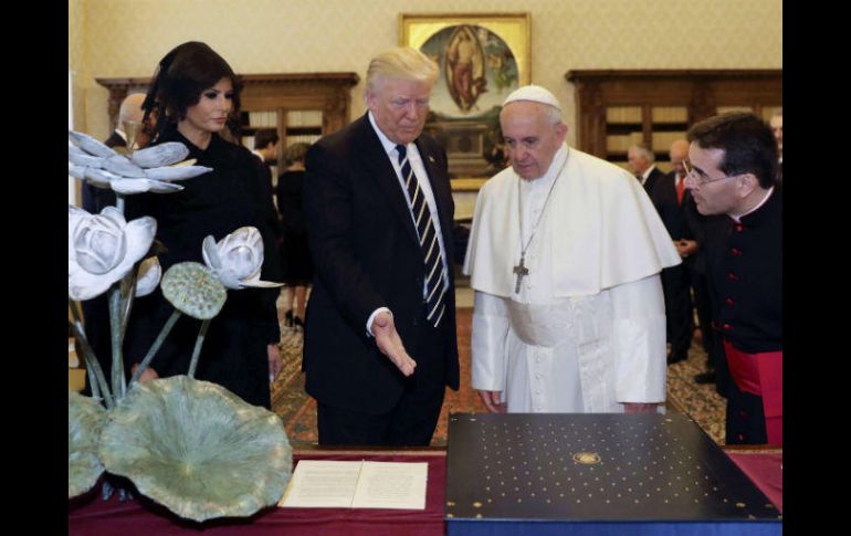 CIUDAD DEL VATICANO (24/MAY/2017).- El papa Francisco y el presidente de Estados Unidos, Donald Trump, se reunieron hoy en el Vaticano durante 27 minutos y después procedieron a la entrega de regalos y a la presentación de la delegación estadounidense.La reunión privada comenzó a las 08:33 hora local (06:33 GMT) y duró algo más de los veinte minutos que suelen durar las conversaciones del papa con los jefes de Estado y Gobierno que le visitan, y hoy el pontífice tiene previsto presidir posteriormente la audiencia general en la Plaza de San Pedro.Después Trump presentó a la delegación, de la que forman parte su esposa Melania; su hija mayor, Ivanka, y su yerno, Jared Kushner, además del secretario de Estado, Rex Tillerson; el asesor de seguridad nacional el teniente general H.R. McMaster, y la portavoz presidencial, Hope Hicks, además de otras ocho personas y una intérprete.Francisco saludó con cordialidad a Melania a quien preguntó si habían "comido pizza", y después bendijo un objeto que la esposa del presidente tenía en la mano.También Ivanka dijo algunas palabras al pontífice, quien escuchó sin hablar.Después en la tradicional entrega de regalos, Trump le dio un libro en una elegante caja.Francisco, por su parte, le entregó sus tres escritos principales: las encíclicas Evangelii Gaudium y Laudato Si y la exhortación Amoris Laetitia y su último mensaje de la jornada de paz; además bendijo un rosario que se le presentó en una bandeja delante de los Trump.Pero el regalo más simbólico fue el medallón de bronce que regala a muchos jefes de Estado, que representa un olivo que crece entre una piedra partida.Explicó entonces a Trump con ayuda de su intérprete que le gusta regalarlo para que los mandatarios sean "unión para la paz".El papa Francisco había recibió a Trump con un apretón de manos y un "encantado de conocerle", en inglés, en la Sala del Tronetto, y Trump le contestó "gracias" y "es un honor".Después pasaron a la biblioteca para la reunión, que se celebró con ayuda de un intérprete, ya que, como se justificó Francisco ante el presidente, su inglés no es muy bueno.Mientras duró la reunión, Melania e Ivanka Trump visitaron la Capilla Paolina y la Sala Regia del Vaticano, y después esperaron charlando con la delegación y representantes del Vaticano en una sala adyacente.Trump llegó acompañado de su esposa, Melania, con vestido negro, el pelo recogido y ataviada con una mantilla corta negra, y fueron escoltados por los "gentilhombres" del papa y la Guardia Suiza a los apartamentos pontificios.Ivanka por su parte lucía también un vestido negro y un vaporoso velo.El presidente de EU se reunirá después con algunos de sus asesores, entre ellos su yerno, con el secretario de Estado vaticano, Pietro Parolin, y con el secretario para las Relaciones con los Estados, Paul Richard Gallagher.Tras la reunión con el papa, Trump y la delegación estadounidense visitarán la Capilla Sixtina y la basílica de San Pedro.