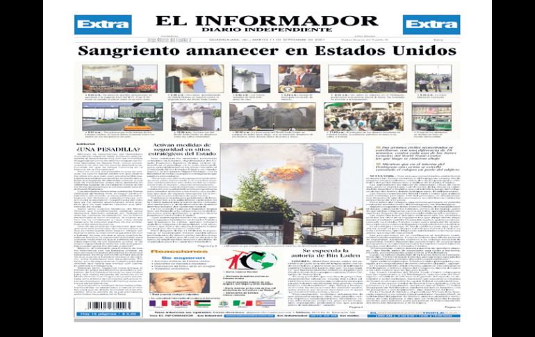 Internacional | Psicosis mundial El pánico por los ataques en Nueva York alcanzó a los tapatíos En Guadalajara la tensión abarcó al el sector empresarial, la Iglesia, así como el sector político Por: EL INFORMADOR 11 de septiembre de 2011 - 03:37 hs En la imagen, la portada del especial que publicó EL INFORMADOR el “martes negro” de hace 10 años. EL INFORMADOR / GUADALAJARA, JALISCO (11/SEP/2011).- La mañana del 11 de septiembre de 2001 el mundo se despertó con una noticia que parecía de película de terror. Para la ciudadanía era una noticia increíble; para los medios, una de las mayores coberturas especiales a las que se han enfrentado. Tres aviones secuestrados embistieron las Torres Gemelas de Nueva York y el Pentágono en Washington y se hablaba de un cuarto avión que se desplomó antes de llegar al blanco en el que se estrellaría. A las 9:00 horas los noticieros de todo el mundo — y aquellos canales que suspendieron su programación para dar el reporte urgente— dieron a conocer que un segundo avión se aproximaba a la segunda torre del World Trade Center (WTC) en la Gran Manzana, ya que a las 8:48 se había estrellado el primer avión en la torre norte. A las 9:06 horas el segundo avión se impactó contra la segunda torre. Eran quince minutos antes de que dieran las 10 de la mañana de ese oscuro 11 de septiembre cuando otra aeronave se estrelló contra el Pentágono, provocando de inmediato la evacuación del edificio. Las especulaciones principales apuntaron a la organización terrorista de Afganistán, Al Qaeda, dirigida por Osama bin Laden. Sin embargo el entonces presidente estadounidense, George W. Bush, sólo pidió un minuto de silencio al enterarse de los atentados. Vicente Fox Quesada, el entonces presidente de México, expresó sus condolencias y condenó los atentados. En un mensaje dado a conocer un día después de los ataques, el mandatario mexicano expresó que México se encontraba unido con su país vecino ante la tragedia. Cobertura local Como todos los medios de comunicación internacionales, EL INFORMADOR hizo una cobertura especial y local. Un día después de los atentados las reacciones locales no se hicieron esperar. Guadalajara vivió momentos de tensión, el sector empresarial, la Iglesia, así como el sector político se hizo presente en el pánico mundial que dejaban los atentados. A primera hora del 12 de septiembre, el cardenal Juan Sandoval Íñiguez dejó saber que el clero tapatío condenaba los ataques y lamentaba las miles de muertes provocadas por éstos. Al mismo tiempo la Procuraduría General de la República en Jalisco condenó los actos y descartó que en el Estado hubiera presencia de grupos terroristas ya que los servicios de Inteligencia no habían detectado ninguna célula de este tipo. En el sector empresarial, el presidente de la Cámara Nacional de Comercio de Guadalajara, Alejandro Padilla, dejó saber la preocupación principalmente por las exportaciones. En ese entonces Padilla dijo: “Lo primero que percibo es el cierre de aerolíneas y vías marítimas lo cual frena la economía del mundo e impactará directamente en las exportaciones de México”. Los movimientos policiales no se hicieron esperar. Las autoridades locales desplegaron medio centenar de agentes policiacos de diversas corporaciones municipales, estatales y federales para que resguardaran el consulado norteamericano en Guadalajara. Aunque no hubo ningún evento irregular en las inmediaciones. Una encuesta realizada en Guadalajara ese día por la empresa Marketing 2000 para EL INFORMADOR, reveló la opinión de la comunidad tapatía respecto al atentado. Al ser interrogados sobre su primera reacción al enterarse del atentado 31% respondió que sí tuvieron miedo, 18% sintieron tristeza por lo sucedido y 9% reaccionó con sorpresa. La incertidumbre y el pesimismo fue el común denominador para los tapatíos encuestados con respecto de probables consecuencias para el Estado, 43% ignoraba qué pudiera pasar en su entorno, mientras que 12% señaló que probablemente serían cerradas las exportaciones, en tanto que 7% supuso que disminuirían las fuentes de trabajo en la región. NUMERALIALa tragedia en cifras 40mil personas trabajaban en las Torres Gemelas, en Nueva York. 24mil personas laboraban en el Pentágono. 266 sujetos a bordo de los cuatro aviones secuestrados murieron. 35,500 reservistas militares fueron movilizados por George Bush para lo que llamó “la primera guerra del Siglo XXI”. 110 pisos tenía cada estructura de las Torres Gemelas. 19 terroristas murieron en los ataques. 343 bomberos murieron en el rescate. 23 policías murieron en el sitio. 37 agentes de la Autoridad Portuaria de Nueva York y de Nueva Jersey fallecieron en el rescate. 3mil muertes se estima que hubo a causa del atentado. 6mil personas habrían resultado heridas. 9.60 pesos costaba el dólar tras el atentado. 31 dólares costaba cada barril de petróleo en la cotización mundial. Testimonio“Todavía no me cabe en la cabeza el tamaño de la tragedia” El ingeniero en sistemas Juan Bosco, nacido en Zamora, itesiano y avecindado en Guadalajara desde 1998, tiene hoy 31 años de edad y pasará el domingo 11 de septiembre de 2011 en casa, luego de un merecido sábado de fiesta. Hace 10 años, en contraste, estaba haciendo su servicio social en la Asociación Tepeyac, una organización de ayuda a migrantes en Nueva York: la noche anterior, él y sus compañeros se acostaron tarde y despertaron para descubrir que las Torres Gemelas, perfectamente visibles desde la azotea, estaban en llamas. Bosco recuerda la historia sin sobresaltos, pero admite que lo ocurrido el 11 de septiembre de 2001 fue un vuelco muy difícil de estimar: “Fue una tragedia, pero, a pesar de haber estado allí cerca y de haber ayudado a personas afectadas, todavía no lo dimensiono, todavía no lo creo. Todavía no me cabe en la cabeza el tamaño de la tragedia”. Como este ingeniero, va