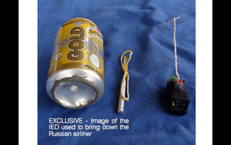 Internacional | Exhiben una lata de una bebida gaseosa y lo que parecen ser componentes de bomba Estado Islámico muestra bomba que derribó avión ruso Exhiben una lata amarilla de la bebida gaseosa Schweppes Gold y lo que parecían ser otros componentes de bomba Por: AP 18 de noviembre de 2015 - 09:22 hs EL CAIRO, EGIPTO (18/NOV/2015).- El grupo extremista Estado Islámico hizo pública una foto de la bomba que afirma fue utilizada para derribar un avión de pasajeros de Rusia en la península del Sinaí en Egipto el mes pasado, en donde murieron las 224 personas que iban a bordo. La foto fue publicada en la edición más reciente de la revista en inglés del grupo extremista con la leyenda "EXCLUSIVA - Imagen del IED (artefacto explosivo improvisado) utilizado para derribar la aeronave rusa". La foto mostraba una lata amarilla de la bebida gaseosa Schweppes Gold y lo que parecían ser otros componentes de bomba. El grupo extremista, que tiene un poderoso grupo aliado en Sinaí, ya había afirmado haber derribado el avión sin ofrecer mayores detalles. La agencia de seguridad rusa FSB dijo el martes que una bomba derribó al avión. La mayoría de las personas a bordo eran turistas rusos. Egipto aún investiga la causa del incidente. Temas Europa Francia Terrorismo Rusia Estado Islámico Lee También La paz “se le cae a pedazos” ¿Por qué Nicolas Sarkozy, expresidente de Francia, fue encarcelado en La Santé? Cierre del Museo del Louvre tras robo exprés de joyas frustra a turistas Trump espera que la guerra termine sin tener que enviar misiles Tomahawk a Ucrania Recibe las últimas noticias en tu e-mail Todo lo que necesitas saber para comenzar tu día Registrarse implica aceptar los Términos y Condiciones