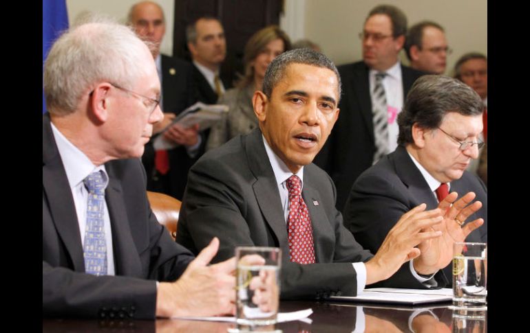 Internacional | Si la economía europea se contrae será más difícil crear puestos de trabajo, considera Estados Unidos dispuesto a hacer su parte para resolver crisis de deuda: Obama Celebró el presidente estadounidense, cumbre entre su país y la Unión Europea Por: EFE 28 de noviembre de 2011 - 12:47 hs El presidente del Consejo Europeo (i) y el presidente de la Comisión Europea (d) en la Casa Blanca conversando con Obama (c). AP / WASHINGTON, ESTADOS UNIDOS (28/NOV/2011).- El presidente estadounidense, Barack Obama, afirmó hoy al término de la cumbre entre su país y la Unión Europea que Estados Unidos "está dispuesto a hacer su parte" para resolver la crisis de la deuda en Europa. En declaraciones junto al presidente de la Comisión Europea, José Manuel Durao Barroso, y el presidente del Consejo Europeo, Herman Van Rompuy, Obama insistió en que hacer frente a la crisis es "enormemente importante" para EE.UU., pues si la economía europea se contrae "es más difícil crear puestos de trabajo" en EE.UU. Temas Norte América Estados Unidos Unión Europea Deuda Recibe las últimas noticias en tu e-mail Todo lo que necesitas saber para comenzar tu día Registrarse implica aceptar los Términos y Condiciones