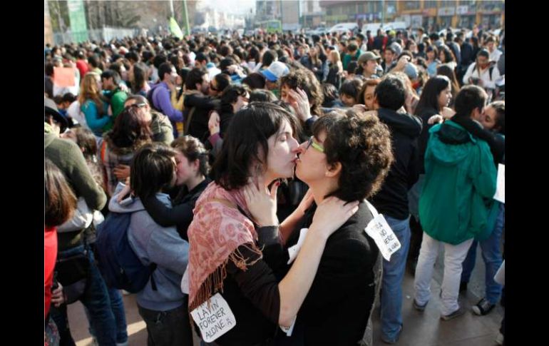 Internacional | La plaza de Armas de Santiago fue testigo de la protesta denominada 'besatón' Estudiantes chilenos se besan para exigir una mejor educación La manifestación persigue reformas en la educación pública, como el aumento del aporte fiscal y acabar con el esquema que permite a algunas universidades privadas recibir fondos estatales Por: AFP 7 de julio de 2011 - 09:30 hs SANTIAGO, CHILE (07/JUL/2011).- Miles de estudiantes universitarios realizaron este miércoles en Santiago una original protesta denominada 'besatón', en la que parejas se besaron por varios minutos para exigir mejoras para la educación pública en Chile, informaron organizadores de la manifestación. La singular protesta se concentró en la central plaza de Armas de Santiago, donde parejas de universitarios se besaron simultáneamente, a la orden de los organizadores, en un ambiente pacífico acompañado por una comparsa musical. "Convocamos a la 'besatón' mediante las redes sociales y la elegimos porque es una forma de entrega de compromiso, porque queremos que eso haga el Estado con la educación, y que ponga pasión porque la educación es un derecho", dijo Emma Luza, una dirigente estudiantil. Los estudiantes protagonizaron anteriormente dos masivas manifestaciones que, según los organizadores, reunieron a unos 80 mil universitarios, secundarios y profesores que marcharon por el centro de Santiago. Las protestas persiguen profundas reformas en la educación pública, como el aumento del aporte fiscal (del cuatro por ciento actual del PIB a siete por ciento recomendado por la UNESCO), y acabar con el esquema que permite a algunas universidades privadas recibir fondos estatales y no pagar impuestos, con el argumento de no ser rentables económicamente. Ante la presión de las protestas, el presidente Sebastián Piñera presentó el miércoles lo que el gobierno denominó el Gran Acuerdo Nacional de Educación, que incluye la inyección de cuatro mil millones de dólares al sector, un aumento de casi 80 por ciento de las becas y la creación de una superintendencia de Educación. Pero la propuesta gubernamental fue rechazada por los sindicatos de estudiantes y profesores, que anunciaron un paro nacional para el próximo jueves 14 de julio. Temas América Latina Chile Manifestaciones en el mundo Lee También Cruz Azul vs América • Momentos Destacados • Jornada 13 • Apertura 2025 Jugadores de LaLiga se manifiestan contra el partido en Miami Protestan contra Trump en Estados Unidos ¿Empate entre Cruz Azul y América? Esto pronostica la IA Recibe las últimas noticias en tu e-mail Todo lo que necesitas saber para comenzar tu día Registrarse implica aceptar los Términos y Condiciones