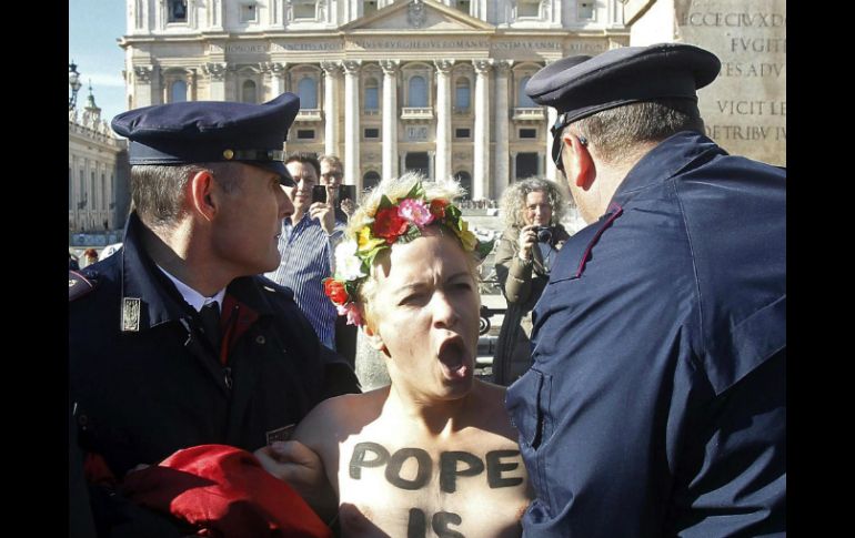 Internacional | ''El Papa no es un político'', gritan en protesta por la visita del Papa al Parlamento Feministas protestan desnudas con gestos obscenos en el Vaticano ''El Papa no es un político'', gritan en protesta por la visita de Francisco al Parlamento Europeo Por: NTX 14 de noviembre de 2014 - 08:46 hs La policía arresta a una activista de la organización Femen durante una protesta convocada en la Plaza de San Pedro. EFE / Stringer CIUDAD DEL VATICANO (14/NOV/2014).- Tres activistas del grupo Femen protestaron durante unos minutos en el Vaticano, desnudas de la cintura para arriba y con gestos obscenos que involucraron tres crucifijos. Poco antes de las 11:00 horas locales (10:00 GMT) las mujeres ingresaron en la Plaza de San Pedro y ante el obelisco central se pusieron en "topless" y ante unos fotógrafos comenzaron a realizar poses sexuales. Llevaban minifaldas negras y en sus cuerpos tenían la inscripción "keep it inside", algo así como "mételo dentro" y se refería a los crucifijos que llevaban en sus manos. Mientras estaban arrodilladas comenzaron a gritar "el Papa no es un político", en referencia a la próxima visita de Francisco al Parlamento Europeo de Estrasburgo, donde el 25 de noviembre dará un discurso inédito. Inmediatamente intervinieron varios agentes de la policía italiana que las bloquearon y las sacaron arrastrando de la plaza. Las detuvieron en la comisaría del Borgo, ubicada junto al Vaticano. Temas Europa Ciudad del Vaticano Papa Francisco Feminismo Lee También Viral: vendedor de carnitas es detenido por matar a extranjero a tubazos en la CDMX Estos son los centros de acopio en CDMX para apoyar a damnificados por lluvias Marchas CDMX: Estas son las afectaciones viales de hoy, 13 de octubre Pronóstico de lluvia hoy, 13 de octubre en CDMX Recibe las últimas noticias en tu e-mail Todo lo que necesitas saber para comenzar tu día Registrarse implica aceptar los Términos y Condiciones