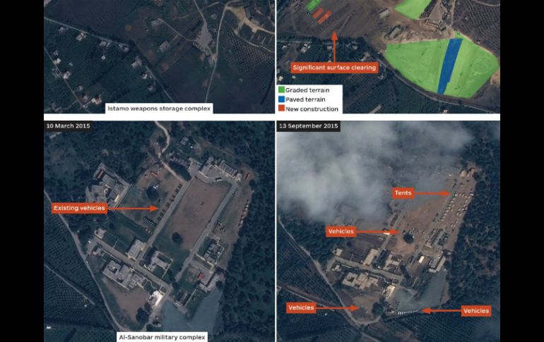 Internacional | Las imágenes muestran la construcción de nuevas edificaciones y un complejo militar Fotos satelitales muestran que Rusia se prepara para Siria Las imágenes muestran la construcción de nuevas edificaciones y un complejo militar Por: AP 22 de septiembre de 2015 - 16:40 hs Las fotografías también mostraban un aumento en jets rápidos estacionados en la pista. AFP / GINEBRA, SUIZA (22/SEP/2015).- Siria podría estarse preparando para recibir fuerzas rusas, según indican imágenes digitales distribuidas por un destacado grupo de investigación de defensa. El grupo IHS Jane's dijo el martes que las imágenes del día anterior muestran la construcción de nuevas edificaciones, despeje de espacios, nivelación de terreno y la presencia de carpas en el complejo de almacenamiento de armas Istamo y en el complejo militar Al-Sanobar, al norte de la ciudad costera de Latakia, en Siria. La publicación dice que las imágenes también mostraban "un aumento importante en jets rápidos estacionados en la pista". Rusia ha sido uno de los principales aliados del presidente Bashar Assad y previamente había anunciado que su reciente reforzamiento militar en Siria estaba diseñado para luchar contra el grupo Estado Islámico. El vocero del presidente Vladimir Putin, Dmitry Peskov, se negó a comentar más el martes. Temas Medio Oriente Rusia Satélites Siria Recibe las últimas noticias en tu e-mail Todo lo que necesitas saber para comenzar tu día Registrarse implica aceptar los Términos y Condiciones