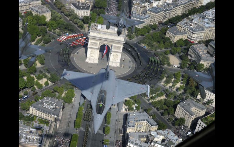 Internacional | Espectáculo aéreo Francia celebra el Día de la Bastilla con desfile militar Incluyen en el festejo tropas destacadas en Afganistán y aviones de guerra que operan en Libia Por: EL INFORMADOR 15 de julio de 2011 - 01:46 hs PARÍS, FRANCIA (15/JUL/2011).- Las fuerzas militares francesas, incluyendo contingentes con tropas destacadas en Afganistán y aviones de guerra que operan en Libia, celebraron el Día de la Bastilla con un tradicional desfile castrense en los famosos Campos Elíseos de París. Y es que, el desfile de este año fue dedicado a las fuerzas que están apostadas en el extranjero. En la imagen, un jet tipo “Rafale” vuela sobre el Arco del Triunfo, en la capital gala, acompañado por tres aviones caza modelo “Mirage 2000-N”. Temas Europa Francia Recibe las últimas noticias en tu e-mail Todo lo que necesitas saber para comenzar tu día Registrarse implica aceptar los Términos y Condiciones