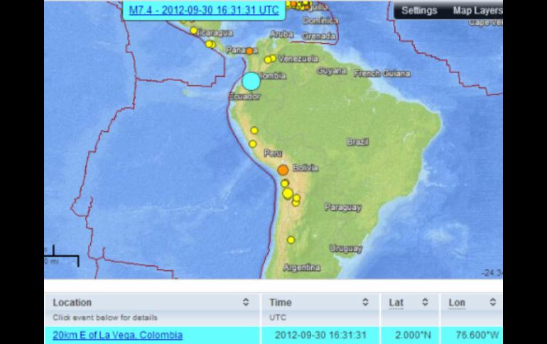 Internacional | El temblor de 7.1 grados Richter no deja daños materiales ni víctimas Fuerte sismo se registra en el suroeste de Colombia El temblor de 7.1 grados Richter no deja daños materiales ni víctimas Por: AFP 30 de septiembre de 2012 - 11:39 hs El Servicio Geológico de Estados Unidos no reporta hasta el momento ningún daño tres el movimiento. (Twitter @OroNoticias). ESPECIAL / LA VEGA, COLOMBIA (30/SEP/2012).- Un fuerte terremoto de magnitud 7.1 golpeó la cordillera de los Andes en el suroeste de Colombia, informó el Servicio Geológico de Estados Unidos (USGS, por sus siglas en inglés), que vigila la ocurrencia de terremotos en todo el mundo. El sismo ocurrió a las 16H31 GMT, a unos 20 kilómetros al este de la ciudad de La Vega, Colombia, y a 326 kilómetros al noreste de Quito, Ecuador, dijo el USGS. El USGS informó inicialmente de una magnitud de 7.4, que poco después revisó la potencia a la baja. No hubo alerta de tsunami y no se han reportado de manera inmediata víctimas o daños materiales en el área afectada. Temas América Latina Colombia Temblor Sismos Recibe las últimas noticias en tu e-mail Todo lo que necesitas saber para comenzar tu día Registrarse implica aceptar los Términos y Condiciones