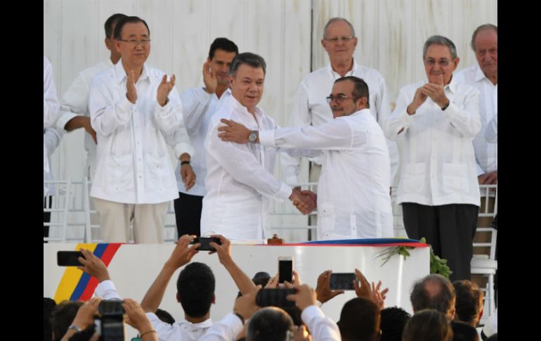 CARTAGENA, COLOMBIA (26/SEP/2016).- El presidente de Colombia, Juan Manuel Santos, y el jefe máximo de la guerrilla FARC, Rodrigo Londoño (Timochenko), firmaron este lunes en la caribeña Cartagena un histórico acuerdo de paz para acabar con 52 años de confrontación armada.En una ceremonia solemne, frente a 15 jefes de Estado y otros dos mil 500 invitados, el mandatario colombiano y el líder rebelde rubricaron con un "balígrafo" (una bala reconvertida en bolígrafo) el pacto de paz, que para entrar en vigor deberá ser ratificado por los colombianos en las urnas el próximo domingo.Entre la audiencia en la explanada frente al Palacio de Convenciones, teñida absolutamente de blanco, había unas 250 víctimas que escucharán a continuación a Santos y Londoño, enemigos por décadas, que lograron lo que parecía imposible.Un gran paso hacia el final del conflicto armado en Colombia, en el que también actuaron otras guerrillas, paramilitares y agentes del Estado, que dejó ocho millones de víctimas, entre ellas 260 mil muertos, 45 mil desaparecidos y 6.9 millones de desplazados.La ciudad amurallada, resplandeciente bajo un sol inclemente, se vistió de gala para la ocasión, adornada con palomas de la paz con una cinta amarilla, azul y roja, colores de la bandera colombiana.Entre los dignatarios asistentes están el cubano Raúl Castro, anfitrión de las conversaciones auspiciadas también por Noruega, Venezuela y Chile; el jefe de la diplomacia estadounidense, John Kerry; el secretario general de la ONU, Ban Ki-moon; el rey emérito de España, Juan Carlos, y numerosos representantes de organismos internacionales.Todos los invitados recibieron como obsequio una réplica del balígrafo usado para rubricar el acuerdo.