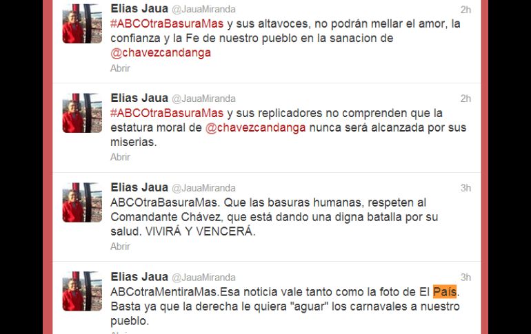 Internacional | El canciller desmiente que Hugo Chávez esté incapacitado para regresar a Venezuela Gobierno venezolano desmiente reporte de ABC El canciller venezolano, Elías Jaua, desmiente que Hugo Chávez esté incapacitado para regresar a Venezuela Por: NTX 9 de febrero de 2013 - 20:16 hs El canciller venezolano, Elías Jaua, desmintió la noticia a través de su cuenta en Twitter. TOMADA DE @JauaMiranda / CARACAS, VENEZUELA (09/FEB/2013).- El canciller de Venezuela, Elías Jaua desmintió esta noche que el presidente Hugo Chávez esté incapacitado para regresar a Venezuela a asumir su cargo. "ABC otra mentira más. Esa noticia vale tanto como la foto de El País. Basta ya que la derecha le quiera 'aguar' los carnavales a nuestro pueblo", indicó Jaua en un mensaje a través de la red social Twitter. El canciller solicitó a los medios internacionales de información respetar la privacidad del jefe del Estado venezolano, quien se recupera en La Habana de una operación del cáncer que padece desde junio de 2011. "ABC otra basura más. Que las basuras humanas respeten al Comandante Chávez, que está dando una digna batalla por su salud. Vivirá y vencerá", precisó el canciller venezolano. El diario español ABC afirmó este sábado que los médicos que lo atienden habrían asegurado a los familiares de Chávez, y a miembros del alto gobierno venezolano, que no podría volver a ejercer sus funciones, porque perdió por completo su capacidad de habla. El rotativo agregó que el Tribunal Supremo de Justicia de Venezuela conocía esta información, y que en los próximos días se realizaría una convocatoria a presidenciales en el país sudamericano. Temas América Latina Venezuela Hugo Chávez Recibe las últimas noticias en tu e-mail Todo lo que necesitas saber para comenzar tu día Registrarse implica aceptar los Términos y Condiciones