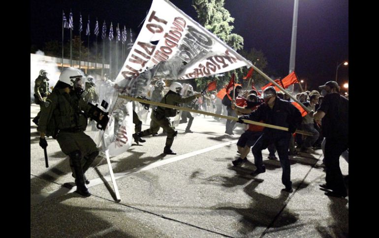Internacional | Asestan zapatazo al primer ministro Griegos protestan contra los planes de austeridad Inconformes salen a las calles por segunda vez en el año por los ajustes del Gobierno Por: EL INFORMADOR 12 de septiembre de 2010 - 04:39 hs Manifestantes y policías chocan en Grecia durante la marcha contra la política de ajuste del premier Giorgos Papandreu. REUTERS / SALONICA, GRECIA (12/SEP/2010).- Miles de griegos se manifestaron, encabezados por los sindicatos, contra las medidas de austeridad del Gobierno, previo al discurso del primer ministro de Grecia, Giorgos Papandreu, en el que se comprometió a reducir este año el déficit público en 40% con respecto al año pasado, cuando llegó a 13.6% del Producto Interior Bruto (PIB). Unas 11 mil personas realizaron tres marchas separadas en Salónica, mientras que cuatro mil 500 policías fueron movilizados para mantener el orden. En mayo, tres personas murieron en un banco incendiado por anarquistas encapuchados que se sumaron a una numerosa manifestación en Atenas, incidente que anonadó a la población y restó fuerza al movimiento de protesta. Unos 600 propietarios de camiones desfilaron ayer en protesta por la desregulación de su oficio. Por otra parte, un hombre lanzó un zapato contra el primer ministro, que acababa de inaugurar la feria mercantil anual de Salónica. El hombre fue detenido y luego liberado al negarse a formular cargos Papandreou. Un borrador del discurso del primer ministro distribuido promete la apertura de profesiones restringidas, incluyendo camioneros, notarios, taxistas y farmacéuticos, además de liberar el mercado energético, establecer metas de privatización y simplificar las licencias de empresas y negocios para fines de este año. El Gobierno socialista de Papandreou dijo que la reducción del déficit presupuestario del 13.6% anual del PIB en 2009, va bien encaminado, y prometió mantener el ritmo. “Deben pasar varios meses más antes de que podamos demostrar que lo hecho hasta ahora no ha sido un destello y que no nos desmoronamos ante los primeros indicios de dificultades”, dijo el ministro de Hacienda, George Papaconstantinou. Grecia a duras penas evitó la bancarrota en mayo, cuando los países europeos y el Fondo Monetario Internacional otorgaron al Gobierno de Atenas créditos de emergencia por 150 mil millones de dólares hasta fines de 2012, a condición de que redujera su gasto público y el déficit. El Gobierno anunció ayer la reforma se la estatal red nacional de ferrocarriles —que debe 13 mil 620 millones de dólares— mediante la reducción de su plantilla laboral y los servicios. Alrededor de 40% de sus seis mil 300 empleados, más de dos mil 500, serán cesados pero les serán ofrecidos otros empleos en el sector público, mientras la empresa encarará la competencia privada. Agentes trasladan al hombre que lanzó el zapato contra el primer ministro de Grecia. El hombre fue liberado más tarde. SONDEOCambios en el gabinete e intención del voto 29.1% de preferencia en el voto es para los socialistas griegos, según un sondeo desarrollado por Kappa Research para To Vima, y realizado tras un cambio de gabinete. 66% de las personas consultadas consideraban que el cambio de gabinete tenía como fin preservar un equilibrio dentro del partido. 21.3% en la intención de sufragio arroja el mismo sondeo para los conservadores, en general en línea con otros sondeos del último mes. Temas Europa Manifestaciones en el mundo Grecia Recibe las últimas noticias en tu e-mail Todo lo que necesitas saber para comenzar tu día Registrarse implica aceptar los Términos y Condiciones