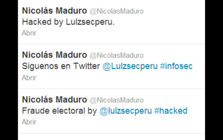 Internacional | Al parecer fue @LulzSecPeru quien hackeó la cuenta del candidato presidencial ''Hackean'' Twitter y páginas web de Maduro Al parecer fue el usuario @LulzSecPeru quien hackeó la cuenta del candidato presidencial Por: NTX 14 de abril de 2013 - 17:20 hs El hacker ha cambiado la información del candidato y mandado algunos tuits en la cuenta. TOMADA DE @NicolasMaduro / CARACAS, VENEZUELA (14/ABR/2013).- La cuenta de Twitter y las páginas web del presidente encargado venezolano y candidato oficialista a la Presidencia, Nicolás Maduro, fue ''hackeada'' hoy minutos antes del cierre de las mesas de votación en Venezuela, aparentemente por el usuario @LulzSecPeru. En su cuenta en la misma red social, el ministro de Comunicación, Ernesto Villegas, atribuyó el ataque a la cuenta de Maduro @NicolasMaduro al "desespero del fascismo" que, según dijo, "queda en evidencia" una vez más. "Desesperados, hackearon también la cuenta del PSUV", el gobernante Partido Socialista Unido de Venezuela, añadió en otro mensaje. El ataque se registró poco antes de las 18:00 (22:30 GMT), cuando está previsto el cierre oficial de las mesas habilitadas para la elección presidencial de este domingo. Además, las paginas web http://www.nicolasmaduro.org.ve/ y http://www.maduro.org.ve/ pertenecientes al presidente encargado de Venezuela también fueron hackeadas por el mismo usuario LulzSecPeru. También fue pirateada la cuenta de la directora de comunicaciones de Presidencia, Teresa Maniglia, y del PSUV, confirmó el jefe del equipo de la campaña oficialista, Jorge Rodríguez, al canal estatal VTV. La cuenta @NicolasMaduro que el gobernante encargado abrió el pasado 17 de marzo y en la que cuenta con 703.294 seguidores fue intervenida después de que durante la jornada el aspirante del chavismo difundiera mensajes invitando a votar. Los venezolanos estaban convocados hoy a las urnas para elegir al sucesor del fallecido presidente Hugo Chávez entre un grupo de siete candidatos, que lideran en intención de voto Maduro y el líder opositor Henrique Capriles. Temas América Latina Venezuela Nicolás Maduro Elecciones en Venezuela Twitter Lee También Chivas y América empatan en partido amistoso 'Chicharito' marca su primer gol al América en partido amistoso "Chucky" Lozano reconoce que jugaría en Chivas o en América ¿Quién ganará el partido entre las América y Chivas? Esto dice la IA Recibe las últimas noticias en tu e-mail Todo lo que necesitas saber para comenzar tu día Registrarse implica aceptar los Términos y Condiciones