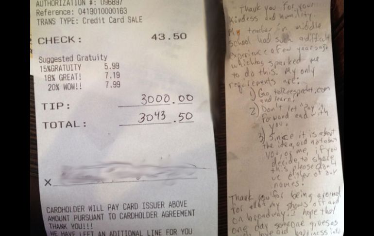 Internacional | Mike hace la gratificación a la mesera que pasaba problemas económicos Hombre deja propina de tres mil dólares en Nueva York Mike hace la gratificación a la mesera que pasaba problemas económicos Por: SUN 13 de mayo de 2015 - 17:54 hs La historia ganó fama en las redes sociales, después de que Claire Hudson, la mesera, compartiera su anécdota. TWITTER / @ReesSpechtLife NUEVA YORK, ESTADOS UNIDOS (13/MAY/2015).- Como cualquier otro día, Mike acudió a comer al mismo restaurante de siempre en Nueva York, sin embargo, en esta ocasión, aunque su cuenta fue de 43 dólares, dejó una propina de tres mil dólares, esto como gratificación a la mesera que pasaba problemas económicos y así continuar con la cadena de favores, que es muy popular en Estados Unidos. Al momento de llegar la cuenta, Mike agregó la jugosa propina y dejó una nota, escrita en una servilleta, donde explicaba los motivos de su acción. "Esta mujer me ha servido durante casi un año. Es una persona simpática y amable que me contó que recibió una orden de desalojo el mes pasado, situación que la dejaría sin hogar", afirmo Mike, quien fue identificado y entrevistado por la Cadena ABC News, sin embargo, no quiso decir su apellido. La historia ganó fama en las redes sociales, después de que Claire Hudson, la mesera, compartiera su anécdota, junto con una foto de la cuenta y el mensaje escrito. Asimismo, en la nota agregó Mike que hizo esa caridad porque alguna vez tuvo un profesor que vivió una situación muy difícil, de la que aprendió la importancia de ayudar a los demás. "Te dejo la propina y mis únicas peticiones son: no dejes que esta cadena de favores acabe aquí y si decides comentar esta acción, no publiques mi identidad", indicó. En entrevista, Mike afirmó que vio la oportunidad perfecta al donar esa propina, para formar parte del proyecto ReesSpecht Life, que es una iniciativa que pretende hacer una cadena de favores, esto con el fin de mejorar la vida de las personas. Temas Norte América Estados Unidos Nueva York Curiosidades Redes Sociales Lee También Revelan llamada al 911 con que se reportó la muerte de Diane Keaton SMN advierte lluvias y bajas temperaturas en México esta semana ¿Cuáles son los beneficios de tomar jugo de betabel y cómo se prepara? ¿Qué frutas pueden comer los perros? Recibe las últimas noticias en tu e-mail Todo lo que necesitas saber para comenzar tu día Registrarse implica aceptar los Términos y Condiciones