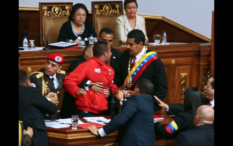 Internacional | El agresor es detenido de inmediato tras arrebatarle el micrófono al mandatario Hombre empuja a Nicolás Maduro en toma de posesión El político rinde protesta en memoria de su mentor, el fallecido Hugo Chávez, en un acto en el que fue investido por el presidente de la Asamblea Nacional Por: EL INFORMADOR 19 de abril de 2013 - 13:03 hs CARACAS, VENEZUELA (19/ABR/2013).- Nicolás Maduro juró este viernes como mandatario de Venezuela, durante el acto en la Asamblea Nacional un hombre se coló hasta la tribuna y despojó del micrófono al presidente Nicolás Maduro, que interrumpió por unos minutos su discurso de investidura. El sujeto, que vestía camisa roja y pantalón negro, logró quitarle el micrófono a Maduro y gritar "Nicolás" sin que se produjeran mayores consecuencias. "Ha fallado la seguridad de este acto", dijo el político, quien aseguró que incluso pudieron haberle disparado, aunque el agresor no parecía ir armado. Tras una breve pausa en su discurso, Maduro declaró que era un ''incidente olvidado'' y continuó con el el acto. Maduro rindió protesta en memoria de su mentor, el fallecido Hugo Chávez, en un acto en el que fue investido por el presidente de la Asamblea Nacional (Parlamento), Diosdado Cabello. "Lo juro por el pueblo de Venezuela, lo juro por la memoria eterna del comandante supremo, que cumpliré y haré cumplir esta Constitución", dijo Maduro, flanqueado por un cuadro gigante de Chávez y con la Carta Magna en la mano izquierda. Maduro, cuya banda presidencial le fue colocada por Cabello y una de las hijas de Chávez, María Gabriela, también juró "construir la patria independiente y socialista para todos y para todas". Temas América Latina Venezuela Nicolás Maduro Lee También Chivas y América calientan en redes el Clásico Nacional de la Fecha FIFA Kevin Álvarez busca aprovechar su oportunidad con la Selección Urge un “hasta aquí” La crisis política de Maduro en Venezuela Recibe las últimas noticias en tu e-mail Todo lo que necesitas saber para comenzar tu día Registrarse implica aceptar los Términos y Condiciones
