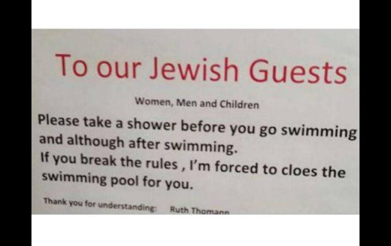 GINEBRA, SUIZA (16/AGO/2017).- El buró de turismo de Suiza lamentó un “desafortunado” incidente en el que un pequeño hotel en los Alpes colocó un aviso que pedía a los “huéspedes judíos” ducharse antes de nadar en la piscina.El Centro Simon Wiesenthal demandó el cierre del hotel Paradies Arosa en la ciudad de Arosa y emitió una declaración el martes en la que llamó a “la comunidad judía y sus amigos gentiles a poner ese horroroso hotel en una lista negra”. En Twitter, la vicecanciller israelí Tzipi Hotovely pidió “justicia” contra la gerencia del hotel.Las autoridades dijeron que el hotel se había disculpado por el incidente y retirado el cartel.El portavoz de Turismo de Suiza Markus Berger dijo que el cartel era inaceptable y añadió: “Siempre hay que mantener la perspectiva. Es un incidente desafortunado”.El letrero decía: “A nuestros huéspedes judíos: por favor, dense una ducha antes de nadar. Si violan las reglas, me veré forzado a cerrarles la piscina. Gracias por su comprensión”.Tzipi Livni, una ex canciller de Israel, colocó en su página en Facebook una imagen del cartel y escribió que “no puede haber tolerancia ni indiferencia” al antisemitismo y el racismo, en comentarios que aludieron también a la violencia en la marcha supremacista blanca en Virginia, Estados Unidos, el fin de semana.Nosotros “no debemos dejar un espacio en el mundo libre para banderas nazis ni máscaras del Ku Klux Klan ni carteles feos en hoteles dirigidos solamente a los judíos”, escribió. “No podemos tolerar que actos de odio contra los judíos en el mundo se vuelvan algo normal”.La gerencia del hotel no respondió de inmediato a un mensaje en busca de comentario.Berger mencionó una tendencia reciente de judíos ortodoxos y otros viajando a las cuatro aldeas alpinas en el área, incluyendo Davos. Dijo que los números habían crecido en años recientes y que muchos hoteles sirven comidas kosher y que los huéspedes judíos se sienten “bien tratados”.“Éste es solamente un incidente con una señora que no está informada”, dijo Berger. “Es un incidente aislado que no necesita una mayor respuesta”.La cancillería suiza dijo que ha estado en contacto con el embajador de Israel y le expresó “que Suiza condena el racismo, el antisemitismo y la discriminación en cualquier forma”.