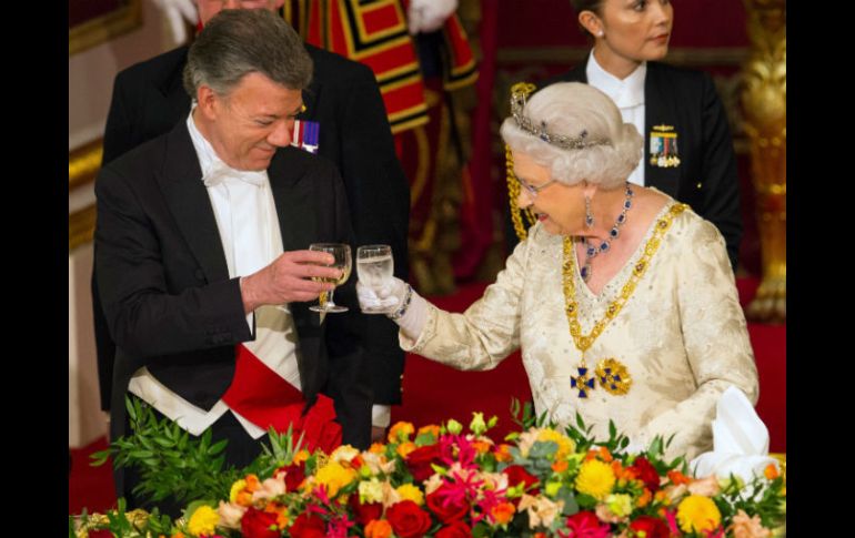 LONDRES, INGLATERRA (01/NOV/2016).- La reina Isabel II de Inglaterra saludó este martes "el coraje y la perseverancia" del presidente colombiano Juan Manuel Santos en un banquete real en el palacio de Buckingham."Aunque ha afrontado contratiempos recientemente, haber alcanzado la cima de un acuerdo de paz histórico, contrariamente a las expectativas de muchos, es un testimonio de su coraje y perseverancia", dijo la monarca en el discurso en honor de su invitado.La reina citó a la escritora Laura Restrepo -"Guerra o indiferencia, no se sabe cuál de los dos es más difícil de lidiar"- y ofreció a Santos el respaldo británico "hacia una paz estable y duradera", y citó el ejemplo del proceso de paz de Irlanda del Norte, que Santos visitará el jueves.A continuación, y después del correspondiente brindis, fue el turno de Santos, que agradeció el apoyo británico al proceso de paz con las FARC, que tendrá que ser renegociado tras el rechazo de los colombianos al mismo en el referéndum del 2 de octubre.A la cena asistieron unos 170 invitados, entre los que se contaban la jefa de gobierno Theresa May, sus principales ministros, embajadores, y personalidades como Ingrid Betancourt, la candidata presidencial colombiana secuestrada por las FARC en 2008, o el tenista británico Jamie Murray, hermano de Andy, que está casado con una colombiana.En el menú, lenguado, faisán, torta de mango, y fruta de la pasión, y siete vinos diferentes, incluido un espumoso inglés.En la cena se usaron cuatro mil cubiertos de plata, mil copas y vasos. Poner la mesa llevó tres días, y lavarlo todo a mano será otro trabajo de titanes.