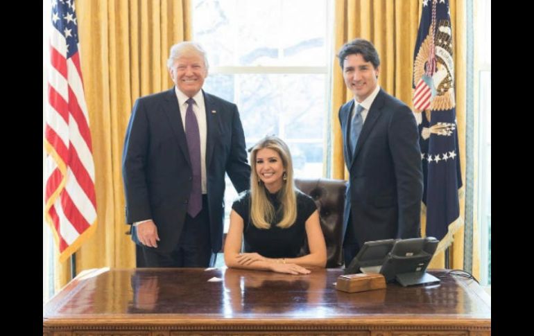 WASHINGTON, ESTADOS UNIDOS (14/FEB/2017).- Ivanka Trump publicó en Internet una foto de sí misma sentada detrás del escritorio en la Oficina Oval mientras su padre, el presidente Donald Trump, y el primer ministro canadiense Justin Trudeau están de pie a ambos lados.La hija del presidente colocó la foto en Twitter, Instagram y Facebook con la leyenda: "Una gran discusión con dos líderes mundiales sobre la importancia de que las mujeres tengan un lugar en la mesa".Los partidarios de Trump la elogiaron en las redes sociales, pero otros la criticaron, aseverando que ella no había hecho nada para merecer esa posición.Ivanka Trump se sentó al lado de Trudeau durante una reunión con mujeres ejecutivas en la Casa Blanca el lunes.