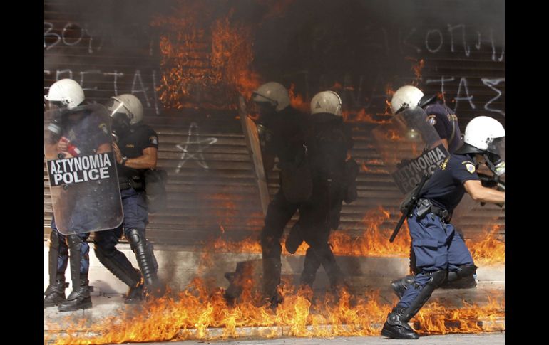 Internacional | Protestan contra un nuevo plan de rigor exigido por la UE y el FMI Jóvenes y policías chocan durante las manifestaciones en Atenas En la plaza Syntagma, pequeños grupos de manifestantes lanzaron cócteles Molotov contra la policía, que usó granadas ensordecedoras y gases lacrimógenos Por: AFP 26 de septiembre de 2012 - 08:12 hs Las manifestaciones en Atenas y Salónica reunieron a 52 mil personas, según la policía. AP / ATENAS, GRECIA (26/SEP/2012).- Las manifestaciones contra un nuevo plan de rigor exigido por la UE y el FMI reunieron este miércoles a decenas de miles de personas en Grecia, donde cientos de jóvenes encapuchados chocaron con la policía en Atenas. En la plaza Syntagma, pequeños grupos de manifestantes lanzaron cócteles Molotov contra la policía, que usó granadas ensordecedoras y gases lacrimógenos. Mientras un cordón policial protegía los hoteles de lujo que bordean la plaza, los jóvenes incendiaron un kiosco de promoción de una compañía telefónica y rompieron vidrieras. Las manifestaciones en Atenas y Salónica reunieron a 52 mil personas, según la policía, que había desplegado unos cinco mil agentes. Grecia vive este miércoles otra jornada de huelga general contra un nuevo plan de rigor exigido por la Unión Europea y el Fondo Monetario Internacional como condición para mantener la ayuda financiera al país, en una nueva prueba para el gobierno en el plano social. "SOS - salven al país, pero por encima de todo a su pueblo" indicaban los carteles de los dos principales sindicatos, GSEE y Adedy. Esta jornada de acción nacional es la tercera del año, pero la primera desde la llegada al poder en junio del ejecutivo de coalición liderado por el primer ministro conservador, Antonis Samaras. La huelga general, apoyada por el principal partido de oposición, Syriza (izquierda radical), quiere denunciar los nuevos recortes de presupuesto de más de 11 mil 500 millones de euros que el gobierno discute con la UE y el FMI. Temas Europa Manifestaciones en el mundo Grecia Lee También Marchas CDMX: HOY, 17 de octubre, estas son las afectaciones viales Sin maíz no hay país Esto se sabe de la megamarcha de maestros en CDMX el 17 de octubre ¿Cómo se despliegan los cárteles mexicanos en Australia? Recibe las últimas noticias en tu e-mail Todo lo que necesitas saber para comenzar tu día Registrarse implica aceptar los Términos y Condiciones