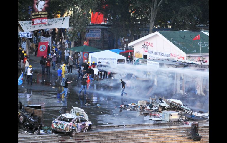 Internacional | Los agentes antidisturbios lanzaron salvas de gas lacrimógenos La policía turca desaloja Taksim y el cercano parque Gezi Los policías se manejaron sin contemplaciones y utilizaron también pulverizadores a presión de gas pimienta de forma indiscriminada contra los acampados Por: EFE 15 de junio de 2013 - 13:12 hs La policía usa un cañón de agua para desalojar a los manifestantes. AFP / ESTAMBUL, TURQUÍA (15/JUN/2013).- La policía desalojó de forma fulminante la céntrica plaza de Taksim en Estambul y el adyacente parque Gezi con cañones de agua, gases lacrimógenos y cargas policiales. Los agentes antidisturbios lanzaron salvas de gas lacrimógenos y varias cargas que hicieron huir a los acampados, y han comenzado ya a desmontar las tiendas del parque, símbolo de las mayores revueltas antigubernamentales en el país en la última década. Los policías se emplearon sin contemplaciones y utilizaron también pulverizadores a presión de gas pimienta de forma indiscriminada contra los acampados, entre ellos familias al completo y la prensa internacional que cubría el desalojo. Temas Medio Oriente Turquía Manifestaciones en el mundo Lee También Sociales: El Informador inicia una nueva etapa con la moderna imprenta "Doña Stella" Llega "La Niña" y este será su impacto según las predicciones No puedo tener piedad de ellos: Hugo Alón, víctima de los ataques de Hamas Lo peor es que Claudia también tiene sus dudas Recibe las últimas noticias en tu e-mail Todo lo que necesitas saber para comenzar tu día Registrarse implica aceptar los Términos y Condiciones