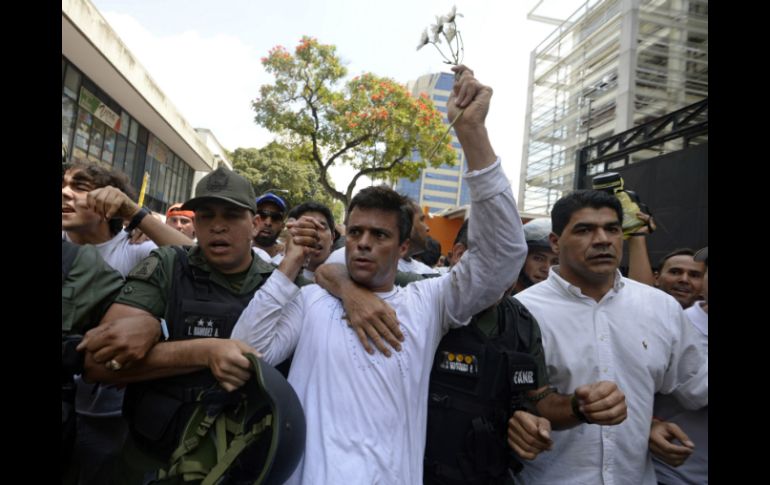 Internacional | El líder opositor se presentó en una multitudinaria marcha y enfrentará su proceso Leopoldo López se entrega a las autoridades venezolanas El líder opositor se presentó en una multitudinaria marcha y enfrentará su proceso legal Por: AP 18 de febrero de 2014 - 10:33 hs CARACAS, VENEZUELA (18/FEB/2014).- Leopoldo López, una de las cabezas de la oposición venezolana, se presentó el martes en una multitudinaria marcha y luego de un breve discurso se entregó a las autoridades para enfrentar un proceso por su presunta responsabilidad en los hechos violentos de la semana pasada. López descartó marchar, como estaba previsto, afirmando que lo hacía para evitar hechos de violencia. "Tenía opción de irme, pero no me voy a ir de Venezuela nunca. La otra opción era quedarme escondido en la clandestinidad y no tenemos nada que esconder", dijo López ante miles de sus seguidores poco antes de caminar hacia un cordón policial, que atravesó para entregarse a las autoridades. Agregó que se presentaba "ante una justicia corrupta" y destacó que si su arresto permite a "Venezuela despertar definitivamente y para que los venezolanos que queremos el cambio, mi encarcelamiento valdrá la pena". "Les ruego que cuando yo pase y me entregue, les pido por favor que tengamos prudencia, sin confrontación", dijo López, quien megáfono en mano y sobre el pedestal de una estatua se dirigió a los manifestantes, muchos de ellos estudiantes. "No arriesgaré a nadie no caigamos en violencia", agregó. Seguidamente avanzó y se montó en un vehículo blindado de la Guardia Nacional. Temas América Latina Venezuela Recibe las últimas noticias en tu e-mail Todo lo que necesitas saber para comenzar tu día Registrarse implica aceptar los Términos y Condiciones
