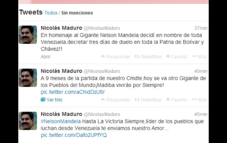 Internacional | Dice que a 9 meses de la partida de Chávez se va otro Gigante de los Pueblos del Mundo Maduro decreta tres días de duelo nacional por Mandela Dice que a 9 meses de la partida de su comandante se va otro Gigante de los Pueblos del Mundo Por: EL INFORMADOR 5 de diciembre de 2013 - 17:21 hs GUADALAJARA, JALISCO (4/DIC/2013).- A unas horas de darse a conocer la muerte del ex presidente Sudafricano, Nelson Mandela, en Venezuela, el Presidente Nicolás Maduro decretó tres días de duelo nacional, esto a través de su cuenta de Twitter. Así lo tuiteó: "En homenaje al Gigante Nelson Mandela decidí en nombre de toda Venezuela, decretar tres días de duelo en toda la Patria de Bolívar y Chávez". Anteriormente, expresó su sentir diciendo "#NelsonMandela Hasta La Victoria Siempre, líder de los pueblos que luchan, desde Venezuela te enviamos nuestro Amor...". Continuó con: "A 9 meses de la partida de nuestro Cmdte, hoy se va otro Gigante de los Pueblos del Mundo ¡Madiba vivirás por Siempre!". Más condolencias Otros mandatarios que se han sumado a las condolencias por la muerte de Nelson Mandela se encuentran: Porfirio Lobo Sosa, Presidente de Honduras; David Cameron, Primer Ministro de la Gran Bretaña; Barack Obama, presidente de Estados Unidos, así como Enrique Peña Nieto, Presidente de México. Temas África Nelson Mandela Nicolás Maduro Decesos de personalidades Lee También Muere Miguel Ángel Russo, entrenador de Boca Juniors La crisis política de Maduro en Venezuela ¿De qué murió Edú Manga a los 58 años de edad? NFL: Muere campeón del Super Bowl XLVII Recibe las últimas noticias en tu e-mail Todo lo que necesitas saber para comenzar tu día Registrarse implica aceptar los Términos y Condiciones