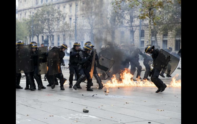PARÍS, FRANCIA (15/SEP/2016).- Al menos 12 protestantes fueron detenidos y seis personas, la mayoría policías, resultaron heridas en una manifestación contra la reforma de la ley laboral en Francia celebrada este jueves en el centro de la capital francesa. Medios locales informaron que un número indeterminado de manifestantes resultó también herido en la marcha en la que los granaderos usaron gases lacrimógenos. Algunos grupos de encapuchados lanzaron bombas molotov contra los granaderos, uno de los cuales resultó quemado en una pierna. Representantes de sindicatos policiales explicaron que los ataques a la policía fueron protagonizados no por manifestantes, sino por personas que fueron deliberadamente a atacar a las fuerzas del orden y a destrozar mobiliario público. Los granaderos evacuaron por la fuerza la plaza de la República en donde concluyó la marcha y en la que fueron destrozadas paradas de camiones y mobiliario público. La protesta, convocada por los principales sindicatos galos, se celebró esta tarde en medio de una alta tensión en un corto recorrido ubicado entre las simbólicas plazas de la Bastilla y de la República. De acuerdo con los primeros balances de los sindicatos, un total de 40 mil personas participaron en la marcha que estuvo vigilada por mil 200 agentes de policía. Según el balance de la policía, entre 12 mil 500 y 13 mil 500 personas participaron en la marcha en la que la policía desplegó cañones de agua y que degeneró en ataques violentos al término del recorrido. Manifestaciones similares se celebraron en un total de 110 ciudades francesas durante la jornada de este día. En Nantes, noroeste, se produjeron también enfrentamientos entre agentes de policía y asistentes a la manifestación convocada. Alrededor de un 15 por ciento de los vuelos con origen o destino Francia fueron cancelados debido a la huelga sindical convocada contra la reforma laboral del gobierno galo, que secundaron parcialmente los controladores aéreos del país, informaron fuentes oficiales. Las cancelaciones y manifestaciones se producen en una jornada de huelga general en la que los principales sindicatos del país convocaron manifestaciones en 110 ciudades de toda Francia, la principal de ellas en París, para presionar al gobierno socialista a que derogue la ley de reforma laboral, aprobada por decreto en verano. Se trata de la decimotercera jornada de huelga convocada por este motivo desde la primera que se celebró el pasado 31 de marzo.