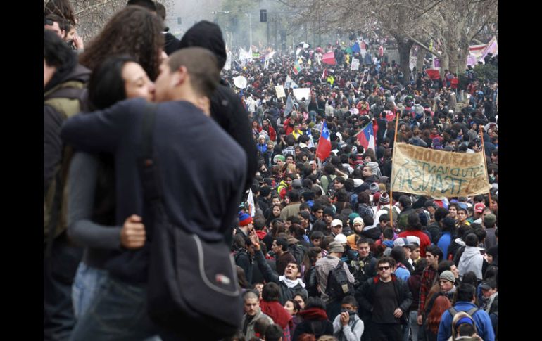 Internacional | Finalizan 48 horas de tensión Marchas, enfrentamientos y saqueos marcan histórico paro en Chile Las calles fueron ''tomadas'' por 600 mil personas que participaron en las distintas manifestaciones, según convocantes; el Gobierno calcula 175 mil Por: EL INFORMADOR 26 de agosto de 2011 - 03:31 hs SANTIAGO, CHILE (26/AGO/2011).- Con banderas chilenas, pancartas y bailes folclóricos, miles de manifestantes, entre quienes destacaba un actor que representaba al ex presidente socialista Salvador Allende, recorrieron bajo un ambiente festivo las calles de Chile en el segundo día de paro nacional, que al final derivó en incidentes, luego de una madrugada de violencia con centenares de detenidos Las movilizaciones organizadas por el mayor grupo sindical del país fueron convocadas con pedidos que van desde una reforma a la Constitución y un cambio en el Código del Trabajo, hasta la rebaja de los impuestos a los combustibles. El llamado fue respaldo por miles de estudiantes que reclaman reformas al sistema educativo, lo que redobló la presión sobre el Gobierno del presidente Sebastián Piñera, golpeado por un desplome de su popularidad. La marcha se enmarca en el ambiente de efervescencia social que desde semanas vive Chile y que ha puesto en jaque al Gobierno de Piñera a 17 meses de haber asumido, obligándolo a reaccionar a protestas que han sitiado las principales ciudades del país. Ayer, manifestantes, en su mayoría estudiantes y profesores, se reunieron en cuatro puntos de Santiago para converger en la céntrica Alameda, a unas dos cuadras del palacio gubernamental, fuertemente custodiado por fuerzas policiales. La Policía cercó con vallas metálicas todo el perímetro que rodea la casa de Gobierno para evitar el avance de los manifestantes, que coparon varias cuadras de la Alameda. La marcha, convocada por la Central Unitaria de Trabajadores (CUT), la mayor sindical del país con 10% de la fuerza laboral, tuvo el carácter festivo y pacífico de las convocatorias pasada de estudiantes y se desarrolló en su mayor parte de manera “ordenada”, según el portavoz oficial, Andrés Chadwick. No obstante, al final se registraron enfrentamientos con grupos de encapuchados que atacaron a la Policía con piedras y palos y saquearon algunos comercios, además de atacar una iglesia, antes de ser dispersados con chorros de agua y gases lacrimógenos. “Ustedes en un año y medio perdieron la votación (conseguida) y tienen que ser más humildes y escuchar al pueblo, a ese pueblo que salió hoy (ayer). No sean arrogantes ni soberbios (señores del Gobierno)”, dijo el líder de la Central Unitaria de Trabajadores, Arturo Martínez. Pese a salir a las calles, “tenemos la impresión que el Gobierno todavía no escucha”, agregó el dirigente al realizar un balance de la jornada. Según los convocantes, esta fue la mayor movilización realizada desde el retorno a la democracia, con más de 600 mil personas que participaron en las distintas manifestaciones, mientras que el Gobierno calculó 175 mil asistentes. Episodios de “destrucción” “Los llamados a parar un país sabiendo que se van a generar episodios de violencia nos hacen preguntarnos qué ha ganado Chile con este paro de dos días que ha dejado compatriotas heridos a bala, establecimientos de comercio saqueados, autos quemados, calles destruidas”, dijo el ministro del Interior, Rodrigo Hinzpeter. Los disturbios de ayer fueron antecedidos por saqueos, barricadas y escaramuzas durante la noche del miércoles y hasta la madrugada, en una jornada vista por el Gobierno como de “destrucción”. En los dos días de paro, un hecho que no ocurría en 20 años, más de medio millar de personas fueron detenidas y decenas de policías y civiles resultaron heridos. Las manifestaciones afectaron mayormente al comercio minorista y el transporte público. Pero analistas no ven un mayor impacto en la economía de la nación minera, cuyo crecimiento estimado para este año es de un 6% a 7 por ciento. Las movilizaciones “podrían tener un efecto en el corto plazo por temor, más que nada (...). No hace mucho sentido que haya efecto en la inversión extranjera”, dijo Fernando Soto, analista de la correduría Banchile. Sindicatos mineros del mayor exportador mundial de cobre dijeron que las faenas han operado sin inconvenientes y el transporte público, los bancos y comercios han prestado sus servicios. El Gobierno advirtió que las protestas podrían haber costado hasta 200 millones de dólares diarios, principalmente por el retraso en las prestaciones de servicios públicos y menores ventas del sector comercio. FRASE "Esta jornada tiene una cuestión de fondo. Hemos dicho que no nos gusta el Chile que tenemos, que no compartimos el Chile que se ha venido construyendo "Arturo Martínez, líder de la Central Unitaria de Trabajadores. Movimiento socialSemiparálisis en la nación, un fracaso: GobiernoSANTIAGO.- El paro nacional de 48 horas convocado por la Central Unitaria de Trabajadores (CUT) de Chile, “no tuvo éxito” y al final “sólo quedó la violencia”, afirmó el Gobierno al hacer un balance oficial de la jornada. El ministro secretario general de gobierno, Andrés Chadwick, dijo que la paralización “no tuvo éxito porque no se logró evitar que las personas no trabajaran o no atendieran a las personas especialmente en el sector público”. Y en segundo lugar, añadió, “estas movilizaciones se van a recordar por los excesos, por el vandalismo que se reflejaron durante estos dos días, especialmente en las noches”. El Gobierno, dijo Chadwick, “reafirma su compromiso para garantizar el orden público, y va a colocar todo sus esfuerzos, a través de Carabineros, para que la gente pueda vivir en paz”. El ministro afirmó que la marcha fue básicamente una manifestación juvenil, “muy similar a las marchas estudiantiles que ya habíamos conocido”. “Lo único que puedo sacar en limpio es q