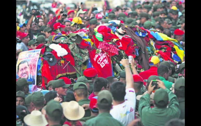 Internacional | Venezolanos están en ''shock'' ante la pérdida del presidente Marea roja arropa la capilla ardiente del comandante Tras seis horas de recorrido, decenas de miles de seguidores acompañaron al mandatario hasta la Academia Militar donde estará hasta mañana Por: EL INFORMADOR 7 de marzo de 2013 - 00:24 hs CARACAS, VENEZUELA (07/MAR/2013).- Los restos del fallecido presidente Hugo Chávez están expuestos desde anoche en la capilla ardiente instalada en la Academia Militar, en Caracas, ante la que desfilan miles de seguidores tras una emotiva ceremonia protagonizada por familiares, mandatarios extranjeros y miembros del Gobierno. “Está ahí, pero mi comandante es inmortal”, dijo Saúl Mantano, un vendedor de 49 años ataviado con una gorra de Chávez y una bandera venezolana, uno de los primeros seguidores en ingresar y ver el ataúd en el Salón de Honor del Libertador Simón Bolívar. “No lo quería ver muerto, pero es una realidad”. “Vi hermoso su rostro. Lo recordaremos como él era, como él vivió”, dijo por su parte Yelitze Santaella, gobernadora del Estado Monagas. El féretro, abierto y sobre el que se colocó la bandera venezolana, fue arropado previamente por sucesivas guardias de honor que iniciaron los mandatarios de Argentina, Cristina Kirchner; Bolivia, Evo Morales; y Uruguay, José Mujica. Una prolongada ovación arrancó la guardia de sus cuatro hijos, Rosa Virginia, María Gabriela, Hugo y Rosinés, así como la que formaron los hermanos del mandatario y su madre Elena Frías, deshecha en lágrimas. El presidente encargado, Nicolás Maduro, y el líder del Legislativo, Diosdado Cabello, también observaron un momento de silencio ante el féretro, al igual que el alto mando militar. Centenares de funcionarios y miembros del oficialismo desfilaron ante la capilla ardiente, que estará abierta 24 horas hasta mañana, antes de que fuera accesible al público a las 21:30 horas. La televisión oficial mostró imágenes del féretro descubierto, sin difundir directamente en pantalla el rostro del mandatario. La Academia Militar fue elegida para las exequias porque Chávez la consideraba su segundo hogar y cuna de su vocación política, que en 1992 le llevó a una fracasada intentona golpista y siete años después a la presidencia de Venezuela. EL CABALLOEl símbolo Un caballo blanco sin jinete, símbolo de la ausencia del presidente, tomó parte de la caravana, al igual que un militar uniformado de gala. LOS HOMBRES CLAVE SIN CHÁVEZNicolás Maduro, presidente interino Maduro, de 50 años, debe asumir la presidencia interina y convocar a nuevas elecciones, que según la Constitución deben celebrarse en los 30 días posteriores a la falta absoluta del presidente. En la fase final de la enfermedad, Maduro asumió las riendas del Gobierno después de que Chávez lo nombrara su heredero político y pidiera que votaran por él en elecciones anticipadas. Diosdado Cabello, Asamblea Nacional Cabello, de 49 años, un ex militar que participó junto a Hugo Chávez en el fallido golpe de Estado en 1992, es la figura de más peso del chavismo después del fallecido presidente y de Nicolás Maduro. Gobernó el Estado Miranda y fue derrotado en las elecciones de 2008 por el opositor Henrique Capriles Radonski. En el golpe de Estado que sacó a Chávez del poder durante 47 horas en 2002, asumió brevemente la presidencia. Elías Jaua, ministro de Exteriores De 43 años, sociólogo por la Universidad Central de Venezuela, tiene una dilatada carrera política en la izquierda venezolana, desde sus años de militancia estudiantil. Forma parte del grupo que entró en contacto con Chávez después de que éste fuera liberado, tras pasar dos años encarcelado por el fallido golpe de Estado de 1992. Fue vicepresidente hasta pocos días después de que Chávez fuera reelecto el 7 octubre, y antes había sido ministro de Agricultura. Candidato por el oficialista (PSUV) el 16 de diciembre para gobernador del Estado de Miranda, pero fue derrotado por el opositor Henrique Capriles. Rafael Ramírez, ministro de Petróleo Ingeniero de 50 años y en el gabinete de Chávez desde 2002, aplicó la reforma petrolera tras la cual la estatal Petróleos de Venezuela (PDVSA), que preside formó asociaciones bajo su control con empresas multinacionales y extranjeras, y montó el financiamiento de las populares misiones sociales con los ingresos petroleros. > ANÁLISISChávez: ¿Santo o demonio? Mtro. Orestes E. Díaz Rodríguez, UDG Siempre resultará difícil hablar de Hugo Chávez sin que se disparen las emociones y las opiniones encontradas. Para unos es el hombre de amplia vocación social que rescató de las sombras a millones de compatriotas dándole la posibilidad de una vida digna a través de mejoras en la alimentación, la educación, la salud y la vivienda. El hombre además capaz de conectarse con grandes auditorios en cualquier parte, que elevó a discurso de Estado una retórica hasta ese momento recluida en el lenguaje cinematográfico y las salas de cines bajo la denominación de cantinflesca, caracterizada por la verborrea, el disparate y la ignorancia, pero también por la espontaneidad, la reivindicación y la picardía. El hombre capaz de comandar un movimiento regional que desafía frontalmente el liderazgo de Washington, sin que ello perturbe las buenas relaciones económicas con el gigante norteño. Para otros es sencillamente el individuo que más ha contribuido a la polarización de su nación inoculando el odio y la división con discursos y decisiones procaces, irresponsables e incendiarios. El hombre que llegó con el propósito de rediseñar la división de poderes para terminar concentrándolos todos en sus manos. El responsable de que se dilapidara en fines injustificados y metas cuestionables el mayor auge económico que ha vivido el país. El individuo que resucitó el sueño del “Libertador” Simón Bolívar para terminar poniendo de rodillas a Ven