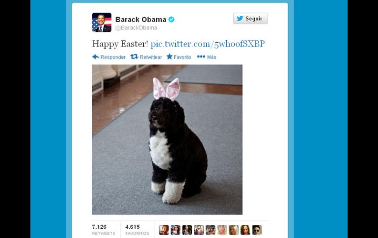 Internacional | Bo, el perro de la familia, desea felices pascuas a los seguidores de Twitter de Obama Mascota de los Obama, en tuit de pascua El perro goza de gran popularidad, continuamente es fotografiado por la prensa estadounidense ya sea en compañía de la primera dama Michelle Obama o de las hijas del matrimonio Por: EL INFORMADOR 31 de marzo de 2013 - 09:47 hs La mascota de la familia Obama protagoniza mensaje de pascua en Twitter del presidente de Estados Unidos. ESPECIAL / GUADALAJARA, JALISCO (31/MAR/2013).- La mascota de la familia Obama protagoniza mensaje de pascua en Twitter del presidente de Estados Unidos. Bo fue, por segunda vez, el encargado de desear "feliz pascua" a la nación americana desde un tuit que fue lanzado desde la cuenta oficial de Barack Obama por la mañana del Domingo. El mensaje ha sido replicado más de seis mil veces (retuits) y hace recordar el video del 2012 donde también aparecía luciendo orejas de conejo y rodeado de huevos de pascua. El perro goza de gran popularidad, continuamente es fotografiado por la prensa estadounidense ya sea en compañía de la primera dama Michelle Obama o de las hijas del matrimonio Obama, corriendo con el presidente enfundado en traje o disfrutando de la nieve en la Casa Blanca. Temas Norte América Estados Unidos Barack Obama Animales Lee También ¿Recibiste correo de rechazo de FIFA? Aquí te decimos cuándo es la siguiente venta Trump se reunirá con Putin para negociar fin de la guerra en Ucrania Trump construirá un arco del triunfo en Washington Ascienden a 70 los muertos por las lluvias de los últimos días Recibe las últimas noticias en tu e-mail Todo lo que necesitas saber para comenzar tu día Registrarse implica aceptar los Términos y Condiciones