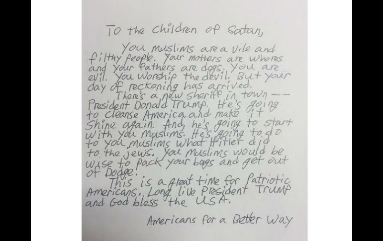 LOS ÁNGELES, ESTADOS UNIDOS (27/NOV/2016).- Tres mezquitas de California recibieron en los últimos días cartas con amenazas contra el Islam que aseguran que el presidente electo Donald Trump "limpiará" Estados Unidos, indicó el domingo la principal asociación de musulmanes en el país.Las misivas, dirigidas a los "hijos del Satanás", descargan insultos contra el Islam y aseveran que Trump "va a limpiar a Estados Unidos y devolverle su esplendor", denunciaron los responsables de la Asociación Cair en California (oeste), al reclamar más protección policial alrededor de las mezquitas.La primera carta fue recibida el jueves en la mezquita de Evergreen de San José, norte de California, y las otras dos este domingo en los templos de Long Beach y Claremont, cerca de Los Ángeles.La policía "debe investigar esta campaña islamófoba contra los lugares de oración en California, pues se trata de un acto de intimidación religiosa", dijo el responsable de Cair en Los Ángeles, Hussam Ayloush."Los dirigentes de nuestro estado deben rechazar la creciente intolerancia contra los musulmanes", agregó en un comunicado.En 2015, la policía registró un aumento de 67% de los actos contra los musulmanes estadounidenses, que representan el 1% de la población.Cair aseguró haber constatado un "aumento de los actos contra musulmanes estadounidenses desde la elección presidencial" el 8 de noviembre.Otras asociaciones que luchan contra el racismo y el Partido Demócrata también han denunciado un aumento de la violencia contra las minorías después de la victoria de Trump, que en campaña tuvo un discurso antimusulmán.