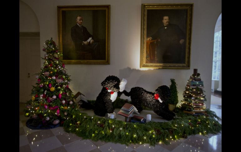 Sunny se robó los reflectores cuando la niña de dos años Ashtyn Gardner perdió el equilibrio y se cayó en el tapete en el momento en que la primera dama Michelle Obama se acercó con el perro (que iba sujetado con correa) al Salón del Comedor del Estado, donde la esposa del presidente e hijos de militares estaban decorando galletas, haciendo flores de papel y utilizando fruta seca para formar pequeñas coronas. Dos réplicas de tamaño natural de los perros de agua portugueses hechos con listón de satín color negro son de las primeras cosas que la gente verá este mes, cuando se espera que 70 mil visitantes recorran la Casa Blanca por la época navideña. Los dos canes mueven sus colas y Bo da la pata. Están rodeados por árboles de Navidad hechos de libros. Versiones en miniatura hechas de chocolate oscuro con la forma de los perros también son parte del despliegue anual de galletas de jengibre de la Casa Blanca. Michelle Obama, quien enfatizó el apoyo a las familias de militares, pidió a los estadounidenses reunirse con la familia y amigos para las fiestas decembrinas y también recordó a los uniformados. "En esta época navideña, mientras nos reunimos con nuestros seres queridos, pido a todo estadounidense recordar lo que nuestras familias de militares y miembros en servicio muchas veces pasan en esta época del año", dijo la señora Obama. "Recordemos los sacrificios que ellos hacen para servirnos con orgullo", agregó. Otra pieza importante de las decoraciones es el árbol de Navidad de la Casa Blanca. El de este año es un abeto Douglas de 5.6 metros de alto (18.5 pies) traído de Lehighton, Pensilvania, que ocupa el Salón Azul. Rinde tributo a las familias de los militares, una tradición de la época de Michelle Obama, y entre sus ramas hay fotos de alegres regresos a casa.