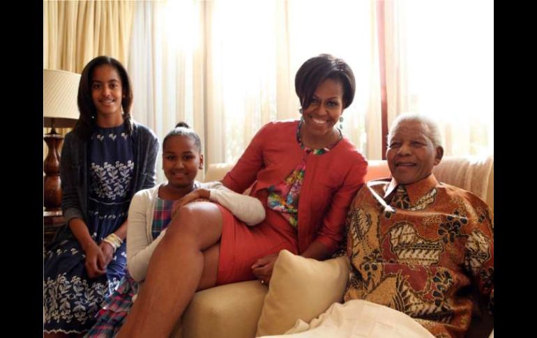 Internacional | El ex presidente de Sudáfrica, lució saludable a sus 92 años de edad Michelle Obama y sus dos hijas se reúnen con Nelson Mandela Nelson Mandela firmó una copia anticipada de su nuevo libro Nelson Mandela By Himself: The Authorized Quotations Book y pasó alrededor de 20 minutos en compañia de la familia Obama Por: AP 21 de junio de 2011 - 09:36 hs Michelle Obama, sus hijas Malia y Sasha junto a Nelson Mandela. EFE / JOHANNESBURGO, SUDÁFRICA (21/JUN/2011).- La primera dama de Estados Unidos Michelle Obama y sus dos hijas se reunieron el martes con Nelson Mandela durante una visita privada en la que el icono en la lucha contra el apartheid lució saludable. Una foto difundida por la Fundación Nelson Mandela mostró al ex presidente de Sudáfrica, de 92 años de edad y retirado en gran parte de la vida pública, sentado en un sofá junto a la señora Obama en la casa de él. En la mano de Mandela había un bolígrafo para que le firmara una copia anticipada de su nuevo libro "Nelson Mandela By Himself: The Authorized Quotations Book" (Nelson Mandela por sí mismo: El libro autorizado de citas textuales). Mandela vestía una de sus camisas características, muy adornada y abotonada en el cuello. La primera dama, sus hijas Malia y Sasha, y la madre de la primera, Marian Robinson, vieron algunos documentos personales de Mandela en la fundación de él cuando según funcionarios de la Casa Blanca el ex gobernante les envió un mensaje de que deseaba conocerlas en su casa, en un barrio lujoso de Johannesburgo. Se trató de la primera reunión de Michelle Obama con Mandela, un prisionero político que después fue el primer presidente negro de Sudáfrica. Mandela pasó 27 años en prisión por su participación en el movimiento de lucha contra el apartheid. Después de su liberación, Mandela se convirtió en el primer gobernante negro surgido de las urnas en el país. Una sobrina y un sobrino que acompañan a Michelle Obama también fueron invitados a la reunión con Mandela. La familia del presidente de Estados Unidos pasó unos 20 minutos con Mandela y su esposa, Graca Machel, quien es una ex primera dama de Mozambique. Temas África Nelson Mandela Sudáfrica Michelle Obama Recibe las últimas noticias en tu e-mail Todo lo que necesitas saber para comenzar tu día Registrarse implica aceptar los Términos y Condiciones