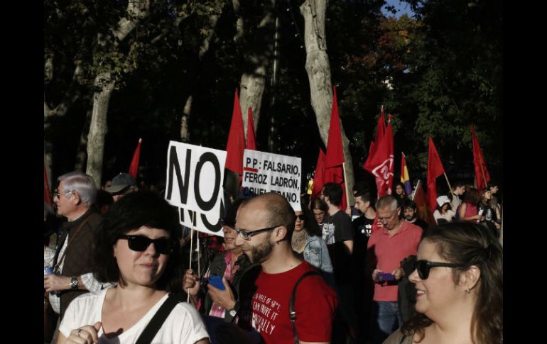 ESPAÑA, MADRID (29/OCT/2016).- Miles de personas se manifestaron hoy en el centro de la capital española para protestar contra la investidura del conservador Mariano Rajoy para un nuevo periodo de gobierno y criticaron al Partido Socialista Obrero Español (PSOE) por abstenerse en esa votación.La abstención del PSOE, que en anteriores ocasiones votó en contra de la investidura de Rajoy, permitirá que el líder del conservador Partido Popular (PP) forme nuevo gobierno, a pesar de que su organización enfrenta varios escándalos de corrupción.Bajo el lema "Ante la mafia, democracia", la movilización fue convocada por grupos sociales afines a la izquierda, e hizo un recorrido desde la plaza de Neptuno, a unos metros del Congreso de los Diputados, hacia la céntrica Puerta del Sol.Con pancartas como "No al golpe de la mafia", "El PP engaña, roba y amordaza", la manifestación también fue una protesta contra el expresidente Felipe González y la presidenta de Andalucía, Susana Díaz, a quienes acusaron de imponer su postura en el PSOE.La concentración contó con la asistencia de diputados de la coalición izquierdista Unidos Podemos como Alberto Garzón, Rafael Mayoral y otros.En la manifestación también se vieron banderas del Partido Comunista de España, del movimiento de indignados 15-M, así como del Sindicato de Estudiantes y otras organizaciones sociales.La policía española desplegó unos mil agentes para resguardar los alrededores del Congreso de los Diputados, donde a esa hora se realizaba la votación de investidura.
