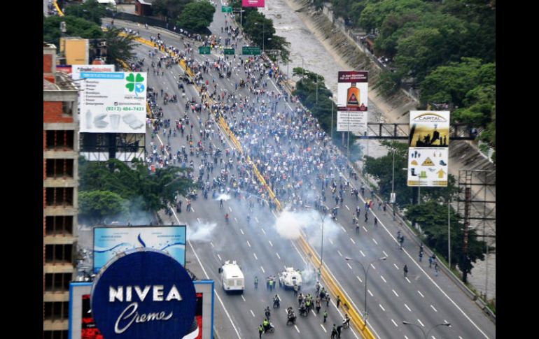 CARACAS, VENEZUELA (20/ABR/2017).- Miles de opositores venezolanos exigieron este jueves en Caracas la salida del poder del presidente Nicolás Maduro, durante una marcha dispersada por los antimotines con gases lacrimógenos, en la tercera semana de violentas protestas que dejan ocho muertos.En un fuerte cruce de bombas lacrimógenas, piedras y cócteles molotov, las fuerzas de seguridad y los manifestantes se enfrentaron en el este de Caracas, en vías de acceso a la estratégica autopista Francisco Fajardo, con saldo de varios heridos o afectados por los gases.Tras dispersar la protesta, la policía y la militarizada guardia nacional lanzaron ráfagas de bombas lacrimógenas y chorros de agua desde vehículos blindados, sobre un grupo de jóvenes que los enfrentó con los rostros cubiertos con pañuelos y capuchas."No me importa tragar gas, no me importa morir, pero tenemos que salir de esta mi… de gobierno asesino y represor", dijo Natasha Borges, de 17 años, en medio del caos.Barricadas de basura fueron quemadas en distintos puntos de la capital. "Libertad", pero también insultos, como "malditos" y "cobardes", les gritaron los manifestantes a los efectivos se seguridad.En un singular episodio, que Maduro calificó como "show", un manifestante desnudo caminó entre una lluvia de gases se subió a una tanqueta militar mientras gritaba: "No lancen más bombas".Los mayores disturbios ocurrieron en Caracas, aunque hubo incidentes en las ciudades de Maracaibo, Valencia y San Cristóbal, un día después de la multitudinaria movilización del miércoles, que dejaron dos jóvenes y un militar muertos, de lo que el gobierno responsabilizó a dirigentes opositores.¡Tenemos que echarle bolas!Los manifestantes, que exigen elecciones generales, no han logrado llegar al centro de Caracas, bastión del chavismo, donde Maduro encabezó el miércoles una masiva concentración de sus seguidores y este jueves participa en una reunión en la instalación militar de Fuerte Tiuna, en el oeste de la capital."Cansancio hay, pero tenemos que echarle bolas (ponerle coraje). Yo estoy dispuesto a salir a la calle todos los días si hace falta", declaró en la marcha Aquiles Aldazoro, un universitario de 22 años.Según la ONG Foro Penal, además de las víctimas mortales, decenas han resultado heridos y suman unos 600 detenidos en total en la ola de marchas de este mes."Mientras más fuertes sean las protestas, más fuerte será la represión", auguró el analista Diego Moya-Ocampos, del centro IHS Markit Country Risk (Londres).La Unión Europea condenó los actos de violencia, Amnistía Internacional alertó por la "represión" y el presidente argentino Mauricio Macri lamentó que no se garanticen las marchas pacíficas.Once países latinoamericanos pidieron al gobierno venezolano garantizar las protestas pacíficas, entre ellos Argentina y Colombia, país al que Maduro calificó como un "Estado fallido"."Instamos a gestos concretos de todas las partes para reducir la polarización", llamó por su lado el secretario general de Naciones Unidas, Antonio Guterres.Elecciones en la miraLas protestas se desataron el 1 de abril, tras sentencias del máximo tribunal electoral, que retiró la inmunidad a los diputados y se adjudicó las funciones del Parlamento, único poder público controlado por la oposición.Maduro, a quien la oposición acusa de hundir al país en una severa crisis económica y política, asegura que las protestas buscan derrocarlo con el apoyo de Estados Unidos y llevar a una intervención militar. Su aliado, el mandatario boliviano Evo Morales, lo secundó en esa afirmación.Maduro, cuyo mandato termina en 2019, dice querer pronto elecciones para derrotar a la oposición. Las de gobernadores debieron realizarse en 2016, pero fueron suspendidas y aún no tienen fecha, las de alcaldes están pautados para este año y las presidenciales para diciembre de 2018.Según las encuestas, siete de cada diez venezolanos reprueban el gobierno, asfixiados por la crisis económica, con una severa escasez de alimentos y medicinas, y una inflación -la más alta del mundo- que el FMI estima en 720.5% este año."La estrategia del gobierno parece ser mantenerse en el poder a costa de lo que sea y evitar que haya elecciones porque la crisis lo hizo bastante impopular", opinó Moya-Ocampos.La oposición afirma que a Maduro lo sostiene la cúpula de la Fuerza Armada, a la que le dio enorme poder económico y militar y que le ha ratificado "lealtad incondicional".Maduro asegura que su gobierno es víctima de una "ciber-guerra" y acusó a la empresa española de telefonía celular Movistar de colaborar en la "convocatoria golpista"; en tanto la automotriz General Motors informó que cerró sus operaciones en Venezuela luego de que el gobierno le confiscara una planta.