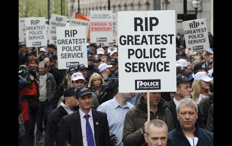 Internacional | Los recortes harían crecer en 3% el índice de criminalidad en cuatro años Miles de policías británicos protestan en Londres contra los recortes La manifestación coincidió con un paro al que sumaron catedráticos, personal penitenciario, empleados sanitarios y de los ministerios Por: EFE 10 de mayo de 2012 - 13:43 hs La ley británica prohíbe ir a la huelga a los policías desde 1919, por lo que todos los participantes pidieron el día libre. / LONDRES, GRAN BRETAÑA (10/MAY/2012).- Miles de policías del Reino Unido tomaron hoy las calles del centro de Londres para protestar contra los recortes aplicados por el Gobierno del conservador David Cameron y el "deterioro" en sus condiciones laborales. Las discrepancias mostradas en los últimos meses por la Policía hacia los planes del Ejecutivo culminaron hoy en una marcha que se hizo coincidir con una jornada de huelga de los empleados del sector público en protesta por los cambios en su sistema de pensiones. "Han recortado el 20 por ciento del presupuesto de la policía pero no solo eso: están traspasando muchos de los servicios que podríamos hacer nosotros a compañías privadas", aseguró a Efe Gary Sutton, inspector de la policía de Kent (sureste de Inglaterra). "Estamos decepcionados, quizás más que otros empleados públicos, pero lo que de verdad nos preocupa es la privatización del cuerpo", dijo Sutton. Miles de policías sin uniforme llegados de diversas ciudades británicas -unos 20 mil según los medios- pasaron frente al Parlamento de Westminster y Downing Street con pancartas que acusaban al "premier" británico de estar "desmantelando" la policía. A medida que avanzaba la marcha, los manifestantes saludaban a sus compañeros de Scotland Yard que, de uniforme, vigilaban que la protesta transcurriera en paz. La manifestación coincidió con un paro al que sumaron catedráticos, personal penitenciario, empleados sanitarios y de los ministerios, lo que afectó en el Reino Unido al funcionamiento de los tribunales de justicia, las oficinas de búsqueda de empleo, aeropuertos y hasta al Parlamento. La ley británica prohíbe ir a la huelga a los policías desde 1919, por lo que todos los participantes en la marcha de Londres habían pedido el día libre en sus respectivos puestos de trabajo, motivo por el cual no podían vestir de uniforme. Para el inspector de Manchester Graham Barry, la manifestación de hoy tenía como objetivo que el Ejecutivo reconsidere "el cambio en los salarios, los cortes en las pensiones y la privatización de la policía". Por su parte, el inspector jefe de Scotland Yard, Robert Cogan, lamentó que el Gobierno haya "decidido atacar a los policías". "Llevo en el cuerpo 25 años y ahora quieren cambiar las condiciones de mi contrato. Cuando me retire, ganaré seis mil libras menos al año (unos 125 mil 636 pesos) respecto a lo que iba a ganar. Mi nivel de vida va hacia atrás, en lugar de hacia adelante", afirmó Cogan. En 2011, un informe de la policía alertó de que los recortes presupuestarios obligarán a reducir 34 mil puestos de trabajo (entre ellos 16 mil 200 agentes) en un plazo de cuatro años, algo que, según el documento, haría aumentar un 3 por ciento los índices de criminalidad en el Reino Unido. Temas Europa Manifestaciones en el mundo Gran Bretaña Recibe las últimas noticias en tu e-mail Todo lo que necesitas saber para comenzar tu día Registrarse implica aceptar los Términos y Condiciones