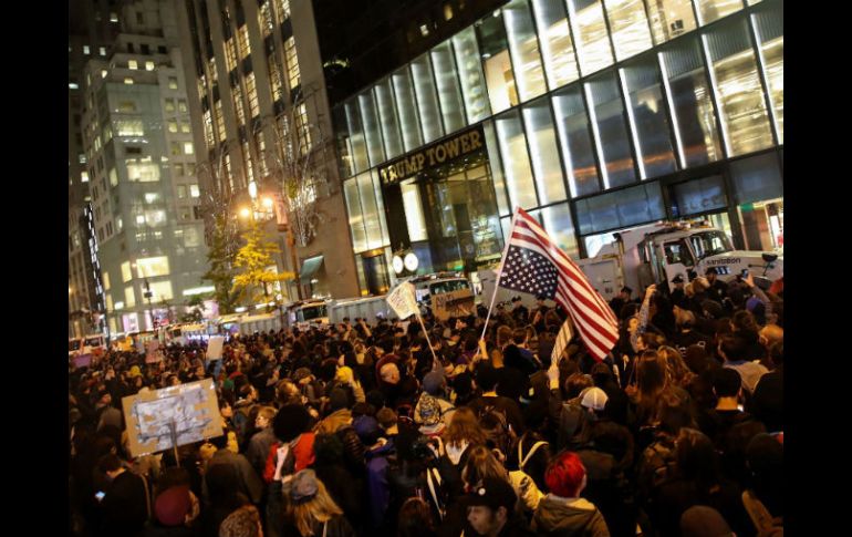 NUEVA YORK, ESTADOS UNIDOS (09/NOV/2016).- Miles de personas participaron hoy en dos manifestaciones en Nueva York en protesta por la elección de Donald Trump como presidente y ambas confluyeron frente a la torre que lleva el nombre del magnate neoyorquino.Los manifestantes, en su mayoría jóvenes, habían sido convocados por organizaciones sociales y grupos políticos de izquierda, unos en la plaza Union Square y los otros en Columbus Circle, cerca de la esquina suroeste de Central Park.Los participantes en las protestas coreaban lemas como "Not my president" (No es mi presidente) y "Stop Donald Trump", entre otros. Muchos asistentes a las manifestaciones portaban cartulinas con esas frases o parecidas.Aunque al inicio de las dos manifestaciones concurrieron centenares de personas, las dos marchas comenzaron a reunir más gente a su paso, y, según cálculos de medios locales, frente a la Trump Tower se habían concentrado unos dos mil manifestantes.Agentes de la policía estaban custodiando el recorrido de la marcha para evitar incidentes, y hasta primeras horas de esta noche no se dio cuenta de disturbios o de detenidos.Manifestaciones parecidas se estaban desarrollando en otras ciudades de Estados Unidos.