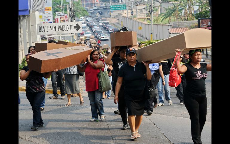 Internacional | Desde que entró en vigencia el delito van más de 50 asesinadas, reclaman Mujeres protestan por feminicidios en Honduras Desde que entró en vigencia el delito van más de 50 asesinadas, reclaman Por: AFP 28 de abril de 2014 - 10:53 hs Se concentraron frente a la Casa Presidencial y marcharon hasta la sede de la Corte Suprema de Justicia. AFP / TEGUCIGALPA, HONDURAS (28/ABR/2014).- Cerca de un centenar de mujeres protestó este lunes en Honduras, cargando ataúdes de cartón, contra los femicidios que permanecen impunes pese a haberse incluido el delito en el Código Penal hace un año. Las participantes en la protesta, miembros de organizaciones como Centro de Derechos de la Mujer (CDM) y Centro de Estudios de la Mujer de Honduras (CEMH), se concentraron primero frente a la Casa Presidencial y marcharon luego hasta la sede de la Corte Suprema de Justicia (CSJ). "Este 26 de abril se cumplió un año de la vigencia de la tipificación del femicidio como delito en el Código Penal de Honduras pero no se han detenido a los femicidas", afirmó a la AFP Gabriela Díaz, activista del CDM mientras cargaba uno de los ataúdes. El artículo 11-A del Código Penal hondureño establece que "incurre en el delito de femicidio, el o los hombres que den muerte a una mujer por razones de género, con odio y desprecio por su condición de mujer y se castigará con una pena de treinta a cuarenta años de reclusión". Pero Díaz lamentó que "desde que entró en vigencia el delito van más de 50 mujeres asesinadas y no hay ni un caso" en los tribunales. Honduras afronta una crisis por la violencia que ubican al país con la tasa de homicidios más alta del mundo, con 79 asesinatos por cada 100 mil habitantes en 2013, según el Observatorio de la Violencia de la Universidad Nacional. Temas América Latina Violencia contra las mujeres Honduras Feminicidios Recibe las últimas noticias en tu e-mail Todo lo que necesitas saber para comenzar tu día Registrarse implica aceptar los Términos y Condiciones
