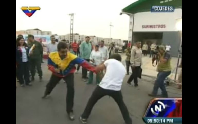 Internacional | El presidente de Venezuela hace la rutina en contra del cantante Gandhi Arocha Nicolás Maduro realiza exhibición callejera de box El presidente de Venezuela realiza la rutina en contra del cantante de hip hop Gandhi Arocha Por: EL INFORMADOR 31 de marzo de 2015 - 20:19 hs GUADALAJARA, JALISCO (30/MAR/2015).- El presidente de Venezuela Nicolás Maduro Moros realiza una "exhibición" de box en contra del pugilista y cantante de hip hop, Gandhi Arocha. El video subido por MultimedioVTV registra el momento en el que Maduro saluda e inmediantamente simula tener una pelea con el artista venezolano. En la grabación se ve incluso al mandatario hacer "juego de piernas" y exclamar "Como Cassius Clay" nombre de pila del boxeador estadounidense Muhammad Ali Los hechos se originan debido a la visita que realiza en mandatario al estado de Cojedes, donde anunció mayor apoyo económico en obras de infraestructura EL INFORMADOR / HÉCTOR NAVARRO Temas América Latina Venezuela Nicolás Maduro Lee También Kevin Álvarez busca aprovechar su oportunidad con la Selección Urge un “hasta aquí” La crisis política de Maduro en Venezuela Detienen a presunto operador del Tren de Aragua en México Recibe las últimas noticias en tu e-mail Todo lo que necesitas saber para comenzar tu día Registrarse implica aceptar los Términos y Condiciones