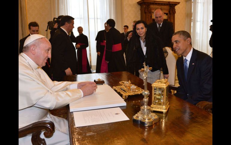 Internacional | Francisco recibe el mandatario junto a toda su delegación en el palacio pontificio Obama inicia su reunión con el Papa Francisco recibe el mandatario junto a toda su delegación en el palacio pontificio Por: EFE 27 de marzo de 2014 - 02:54 hs El Papa Francisco y el presidente de Estados Unidos, Barack Obama, durante su encuentro. AFP / CIUDAD DEL VATICANO (27/MAR/2014).- El papa Francisco y el presidente de Estados Unidos, Barak Obama, comenzaron su reunión hoy con un apretón de manos. Obama, acompañado por el Prefecto de la Casa Pontificia, el arzobispo Georg Ganswein, fue escoltado en el palacio pontificio por los "gentilhombres" del papa y la Guardia Suiza y una amplia delegación de la que formaba parte también el Secretario de Estado estadounidense, John Kerry. Francisco recibió a Obama en la Sala del Tronetto, anexa a la Biblioteca Privada, acompañado por Ganswein. Después pasaron a la Biblioteca privada, donde se sentaron uno frente a otro delante de un escritorio y tras algunos minutos de conversación informal, los fotógrafos, cámaras de televisión y periodistas abandonaron la Biblioteca Privada y comenzó el coloquio privado, con la ayuda de intérpretes. Obama se presentó muy sonriente y dio las gracias al pontífice argentino, mientras que éste mantuvo un semblante más serio. Las reuniones con los jefes de Estado y de Gobierno y el pontífice suelen durar una media de 20 minutos y luego se pasa a los saludos de la delegación y el intercambio de regalos. Como al resto de mandatarios, Jorge Bergoglio regalará su primera exhortación apostólica, "Evangelii Gaudium" (La alegría del Evangelio), publicada el pasado 26 de noviembre. El presidente Obama ya anticipó en una entrevista al diario "Corriere della Sera" publicada hoy, que está "deseoso" de escuchar al papa sobre todo en lo que concierne en la lucha por la justicia social y para erradicar la pobreza. Obama adelantó que explicará al pontífice argentino su compromiso por la lucha contra la desigualdad. Temas Europa Ciudad del Vaticano Barack Obama Papa Francisco Lee También Festival del Pan de Muerto en CDMX: Fechas, horarios y actividades CDMX, con pronóstico de lluvias fuertes hoy sábado Clima en Ciudad de México hoy: el pronóstico para el sábado 11 de octubre de 2025 Hoy No Circula Sabatino: Autos que descansan este 11 de octubre en CDMX y Edomex Recibe las últimas noticias en tu e-mail Todo lo que necesitas saber para comenzar tu día Registrarse implica aceptar los Términos y Condiciones