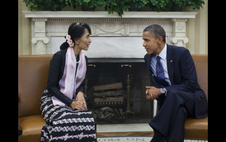 Internacional | El presidente de EU y la líder birmana se reunieron en el Despacho Oval Obama recibe a Suu Kyi en la Casa Blanca El presidente de EU y la líder birmana se reunieron en el Despacho Oval, después de que esta última recibiera la Medalla de Oro del Congreso estadounidense Por: AFP 19 de septiembre de 2012 - 18:41 hs La líder opositora birmana Aung San Suu Kyi, se reúne con el presidente estadounidense, Barack Obama. EFE / WASHINGTON, ESTADOS UNIDOS (19/SEP/2012).- El presidente de Estados Unidos, Barack Obama, recibió a la opositora birmana Aung San Suu Kyi en el Despacho Oval de la Casa Blanca. Obama y Suu Kyi intercambiaron en voz baja impresiones mientras los fotógrafos inmortalizaban el encuentro, el primero entre los dos Nobel de la Paz. Antes de llegar a la Casa Blanca, la opositora birmana recibió la Medalla de Oro del Congreso, que le concedió la condecoración en 2008. Durante el acto, Suu Kyi dijo que Birmania puede "avanzar unida y en paz", aunque alertó que "habrá dificultades" en el camino de las reformas democráticas emprendidas por el nuevo gobierno de su país. "Desde lo más profundo de mi corazón les doy las gracias, ciudadanos de Estados Unidos, por tenernos en vuestros corazones y mentes durante los oscuros años en los que la libertad y la justicia parecían inalcanzables", declaró la política, que permaneció unos 20 años bajo arresto domiciliario. Desde su llegada al poder en 2009, Obama apoyó un proceso de democratización en el país asiático. Coincidiendo con la visita de Suu Kyi, el gobierno estadounidense levantó las sanciones contra el presidente birmano, Thein Sein. Temas Estados Unidos Barack Obama Birmania Casa Blanca Recibe las últimas noticias en tu e-mail Todo lo que necesitas saber para comenzar tu día Registrarse implica aceptar los Términos y Condiciones