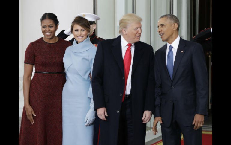 WASHINGTON, ESTADOS UNIDOS (20/ENE/2017).- El presidente saliente de Estados Unidos, Barack Obama, recibió este viernes en la Casa Blanca a su sucesor Donald Trump, con quien compartirá un té antes de la ceremonia oficial de investidura que marcará la transferencia de mando.Obama y su esposa Michelle recibieron a Trump y Melania en la pequeña escalinata de acceso a la Casa Blanca, y todos posaron brevemente para fotógrafos antes de ingresar al recinto.Posteriormente, Obama y Trump irán juntos en una limusina hasta el Capitolio, escenario de la toma de juramento del nuevo presidente.Poco antes de la llegada de Trump a la sede presidencial, Obama fue visto ingresando por última vez al Salón Oval, donde dejó una carta sobre el célebre escritorio utilizado por los presidentes estadounidenses desde el siglo XIX.Es tradición que los mandatarios salientes dejen una nota personal para su sucesor en el escritorio donde son adoptadas tantas decisiones trascendentales para Estados Unidos y el mundo.Trump y Melania iniciaron la jornada con un oficio religioso en la pequeña iglesia episcopal de San Juan, abierta en 1816 y separada de la Casa Blanca por la Plaza Lafayette.Desde las primeras horas de la mañana decenas de miles de personas aguardaban pacientemente al enorme espacio preparado delante de las escalinatas del Capitolio para acompañar la investidura del 45º presidente.Además de las gorritas rojas con letras en blanco ("Make America Great Again") era posible ver también a miles de personas con gorros de lana color naranja y simplemente el número 45, en referencia a Trump.Las fuerzas de seguridad dispusieron de kilómetros de vallas en el centro de la capital estadounidense.La temperatura en Washington oscilaba alrededor de los 6 grados centígrados y el servicio de meteorología prevé lloviznas durante el día.+Sigue el minuto a minuto del día de la investidura de Trump
