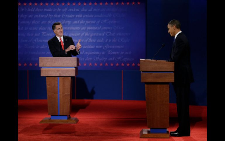 Internacional | Mandatario promete fortalecer clase media; republicano, no recortar impuestos a ricos Obama y Romney chocan sobre economía El mandatario demócrata promete fortalecer a clase media y el republicano no recortar impuestos a ricos Por: EL INFORMADOR 3 de octubre de 2012 - 20:01 hs DENVER, ESTADOS UNIDOS (03/OCT/2012).- El presidente Barack Obama acusó el miércoles por la noche a su rival republicano Mitt Romney de querer "duplicar la apuesta en las políticas" que condujeron a una crisis económica devastadora hace cuatro años. Su rival, apenas unos metros de distancia en el escenario, reviró: "Eso no es lo que voy a hacer". En otro momento del debate aseguró: "La tendencia actual no va a ser suficiente". De esa forma se refirió a la debilidad de la economía y al 8.1% de la tasa nacional de desempleo, que es de lejos el tema dominante en la carrera por la Casa Blanca. Romney aseguró que, bajo las políticas de Obama, "las familias de ingresos medios están siendo aplastadas". La economía y en particular la creación de empleo centraron los minutos iniciales del primer debate entre ambos candidatos a las elecciones del 6 de noviembre, que se celebra en la Universidad de Denver. Obama afirmó que pondrá en marcha un "nuevo patriotismo económico" para crear empleos y "reconstruir" el país con inversiones en educación y energía. "Queda mucho trabajo por hacer, no se trata de dónde estamos, sino de hacia dónde vamos", subrayó Obama. "Nos va mejor a todos cuando le va mejor a la clase media", anotó. Romney, por su parte, aseguró que no recortará los impuestos a los ricos si gana las elecciones y dijo que abrirá nuevas vías comerciales, "sobre todo con Latinoamérica", perseguirá el equilibrio presupuestario y luchará por las pequeñas empresas. "Mi plan no es recortar impuestos para aumentar el déficit", argumentó Romney ante las críticas de Obama a sus propuestas y agregó que pretende simplificar las leyes fiscales para que se creen empleos y reducir el número de personas que necesitan de la caridad para acceder a alimentos. Con información de AP y EFE Temas Norte América Elecciones EU Barack Obama Mitt Romney Lee También Ebrard buscará evitar imposición de aranceles en su visita a EU Hay mejoría, pero el futuro es “incierto” Claudia Año II: es la comunicación Organismo internacional prevé tensión comercial a nivel global en 2026 Recibe las últimas noticias en tu e-mail Todo lo que necesitas saber para comenzar tu día Registrarse implica aceptar los Términos y Condiciones