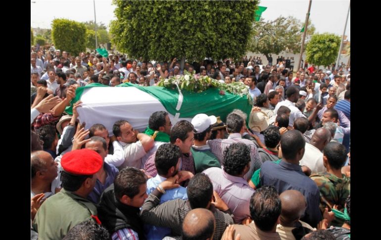 Internacional | Saif al-Arab, de 29 años, murió en un ataque de la OTAN Partidarios asisten a funeral de hijo de Gadhafi El ataúd del hijo menor del líder libio fue cubierto de flores y envuelto por la bandera verde que ha representado a Libia desde que Gadhafi llegó al poder en un golpe de 1969 Por: REUTERS 2 de mayo de 2011 - 12:58 hs El ataúd de Saif al-Arab, fue llevado a través de la multitud hasta una tumba en el cementerio Hani en la capital libia. REUTERS / TRíPOLI, LIBIA (02/MAY/2011).- Partidarios de Muamar Gadhafi se reunieron en Trípoli para el funeral de su hijo, muerto en un ataque aéreo de la OTAN que planteó interrogantes sobre el papel de Occidente en la revuelta contra el líder libio. Las fuerzas de Gaddafi detuvieron su bombardeo del puerto en la ciudad rebelde de Misrata tras nuevos ataques aéreos de la OTAN, pero la terminal permaneció cerrada, dijo un portavoz rebelde, impidiendo abastecer por mar a la asediada ciudad. Los aviones de la OTAN también atacaron durante la noche posiciones de las fuerzas del Gobierno cerca de Zintan, otra ciudad en manos de los rebeldes. Los hechos resaltaron la dependencia del vacilante movimiento rebelde en apoyo militar occidental. Pero el ataque del sábado de la OTAN al complejo de Gadhafi, que según el Gobierno mató a su hijo Saif al-Arab, de 29 años, y a tres de sus nietos, supuso un nuevo giro. El anuncio de las muertes desató ataques de multitudes furiosas contra las embajadas de Gran Bretaña y Francia, además de contra la misión diplomática de Estados Unidos. La OTAN fue acusada de tratar de asesinar a Gaddafi, excediendo el mandato del Consejo de Seguridad de la ONU de proteger a los civiles. El ataúd de Saif al-Arab, cubierto de flores y envuelto por la bandera verde que ha representado a Libia desde que Gadhafi llegó al poder en un golpe de 1969, fue llevado a través de la multitud hasta una tumba en el cementerio Hani en la capital libia. Gadhafi no apareció en el funeral, pero Saif al-Islam, el más destacado de sus siete hijos, acudió junto a su hermanastro mayor Mohammed. Saif al-Arab no tenía hijos, pero tres de sus sobrinos, todos menores de tres años, murieron en la explosión del sábado. Eran hijos de sus hermanos Hannibal, Aisha y Mohammed Gadhafi. Temas África OTAN Libia Recibe las últimas noticias en tu e-mail Todo lo que necesitas saber para comenzar tu día Registrarse implica aceptar los Términos y Condiciones